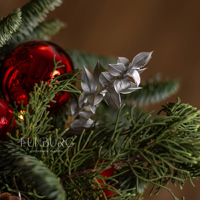 Искрящаяся праздником и предвкушением чудес корзина с пушистым ароматным нобилисом, раскидистыми веточками кипариса и туи, щедро украшенная стеклянными сверкающими елочными шариками, традиционными полосатыми леденцами, роскошными пышными бархатными бантами, бусами, шишками и светодиодной гирляндой. Такая композиция мгновенно подарит новогоднее настроение, которого хватит на всю зиму!