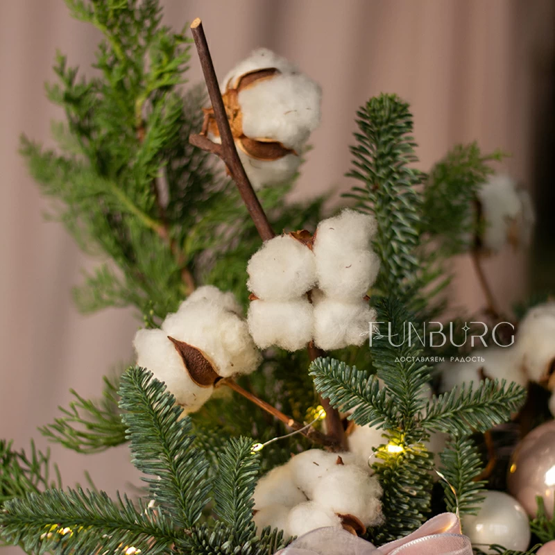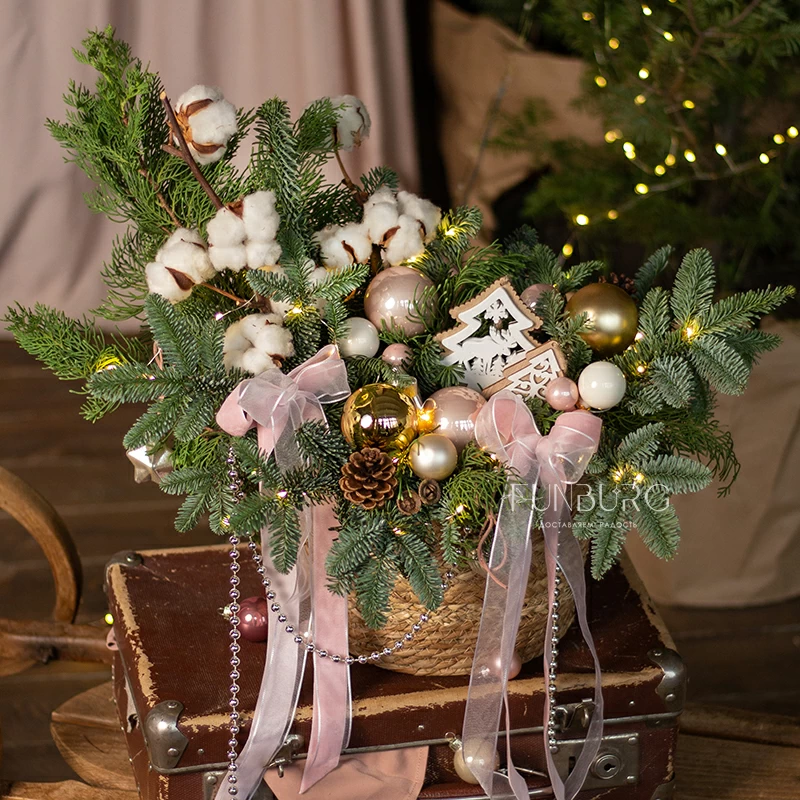 Объемная праздничная корзина с пушистым ароматным нобилисом, раскидистыми веточками кипариса и туи, щедро украшенная стеклянными сверкающими шариками нежно-розового, сливочного и золотого цвета, снежными деревянными игрушками, натуральными шишками, бархатными бантами, бусами и светодиодной гирляндой. Такая композиция мгновенно подарит новогоднее настроение, которого хватит на всю зиму!