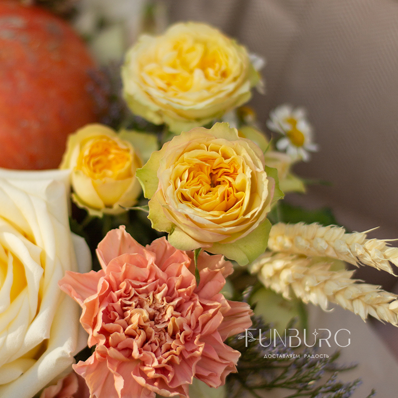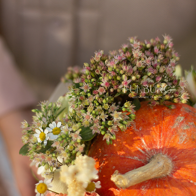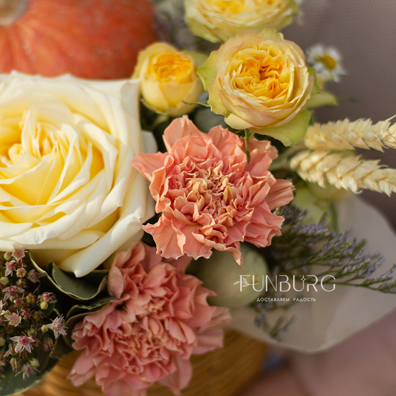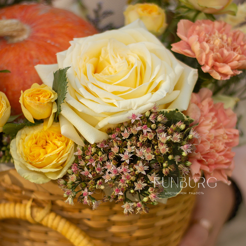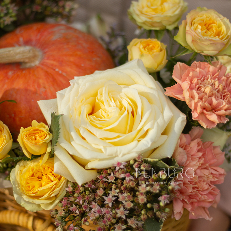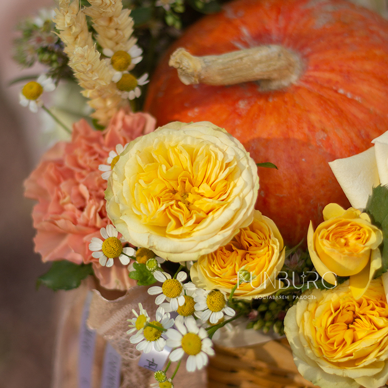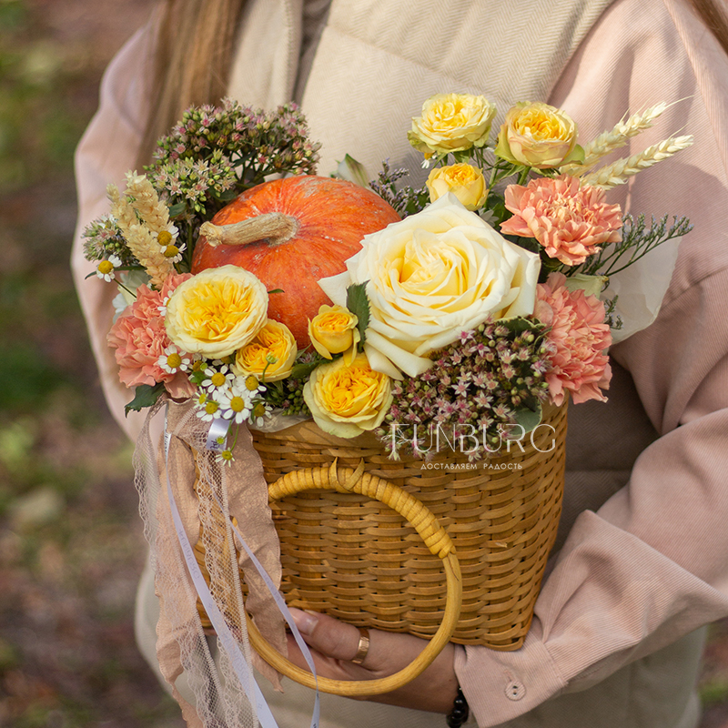 Нежная осенняя корзина в теплых кремовых оттенках с добавлением тыквы и сухоцветов создана дарить уютное осеннее настроение