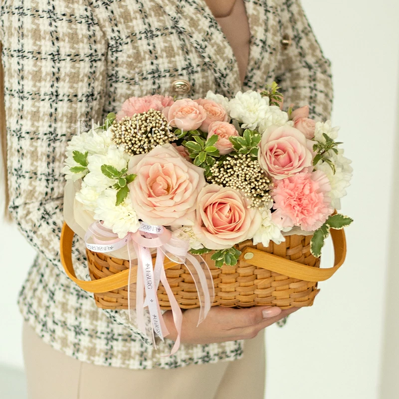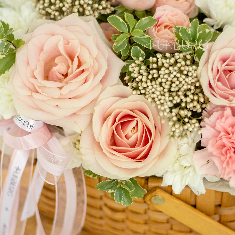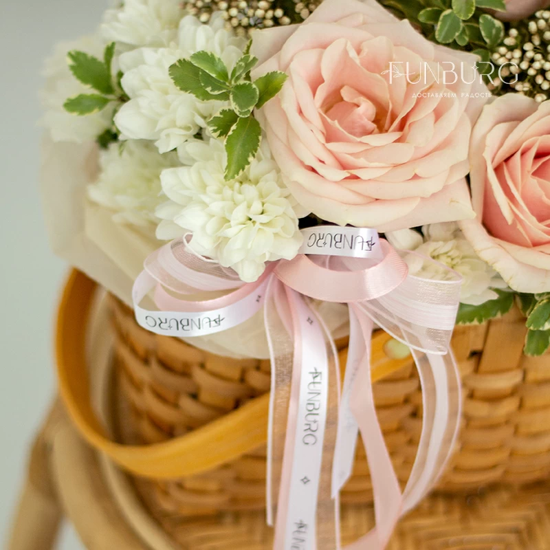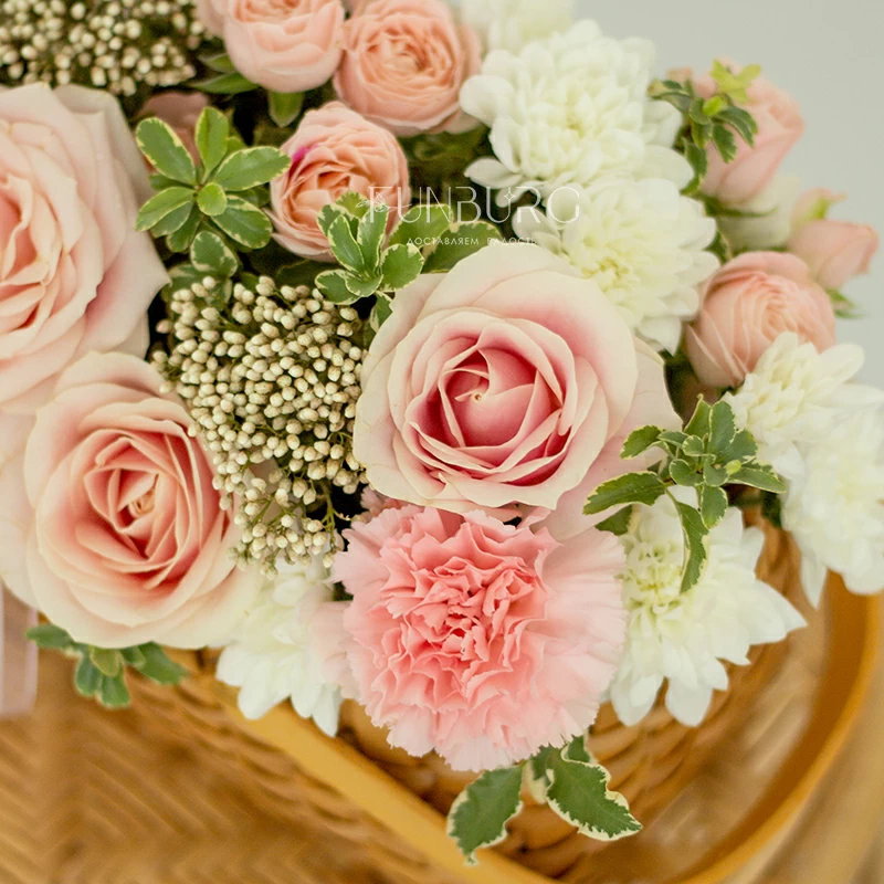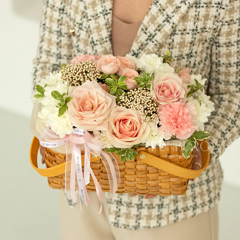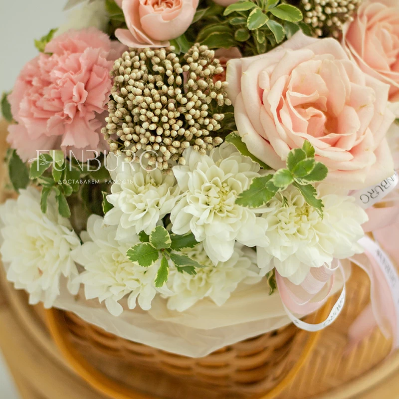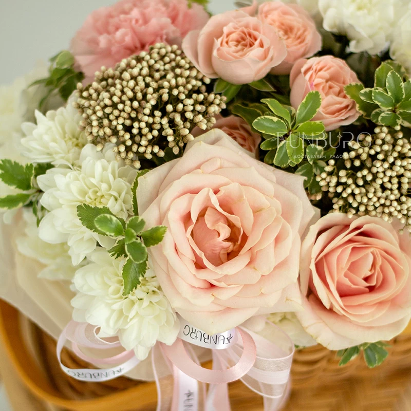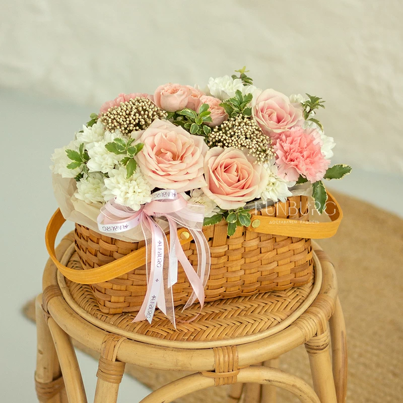 Аккуратная композиция из сливочно-розовых роз, пушистых кустовых хризантем, кружевных персиковых диантусов, жемчужинок озотамнуса и нежных веточек зелени в красивом лукошке. Для самых теплых поздравлений.