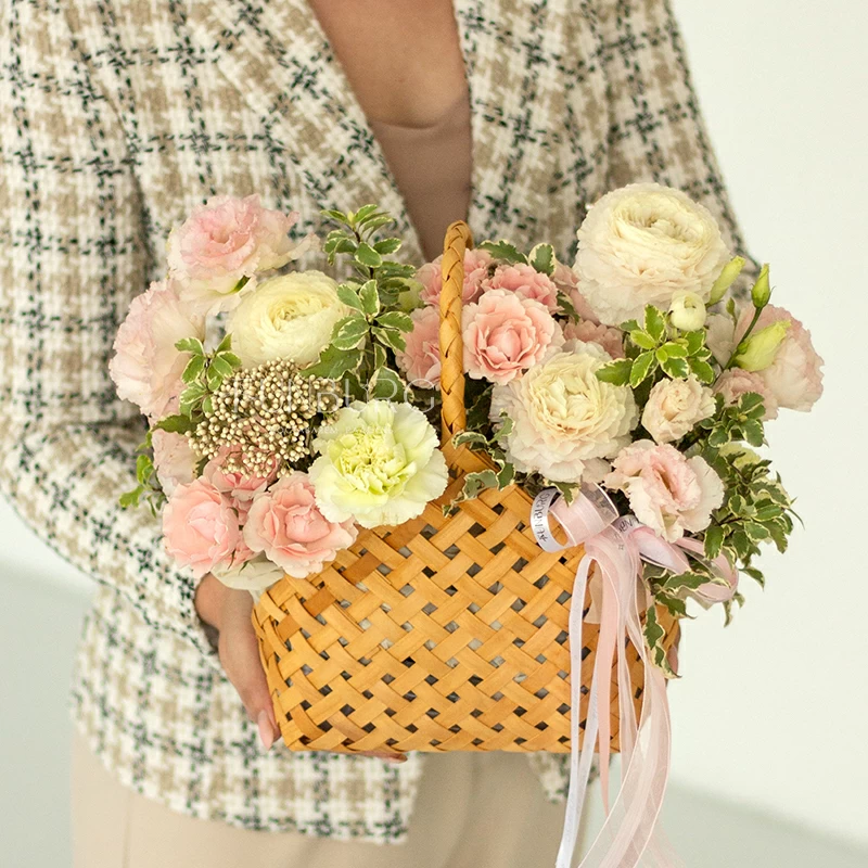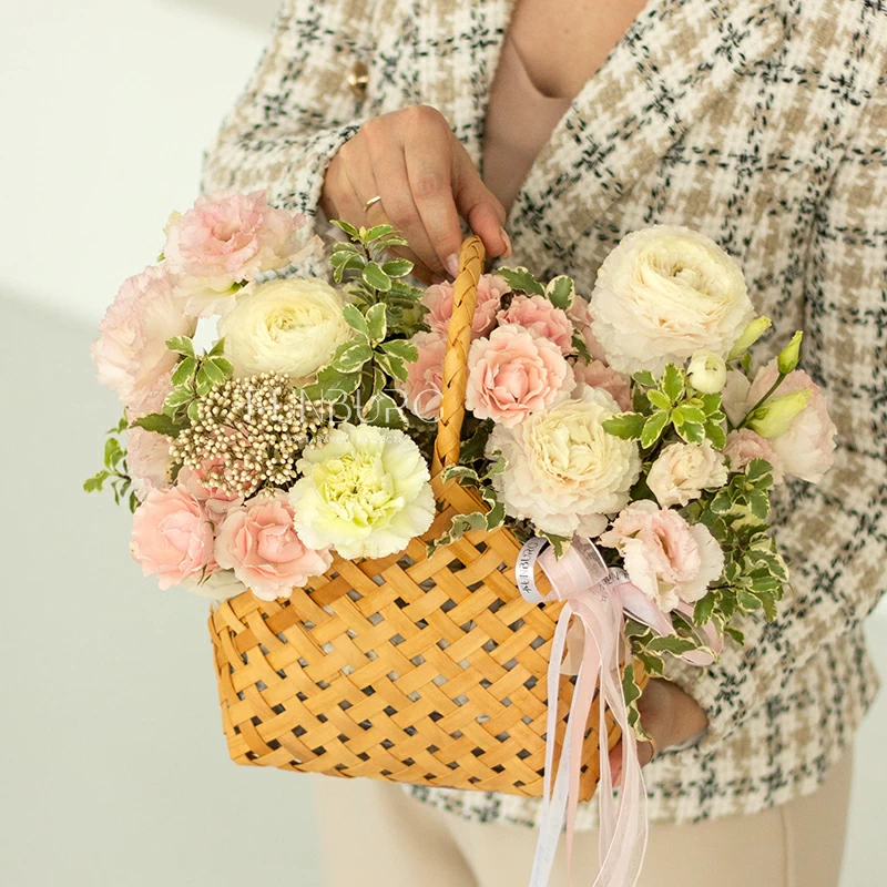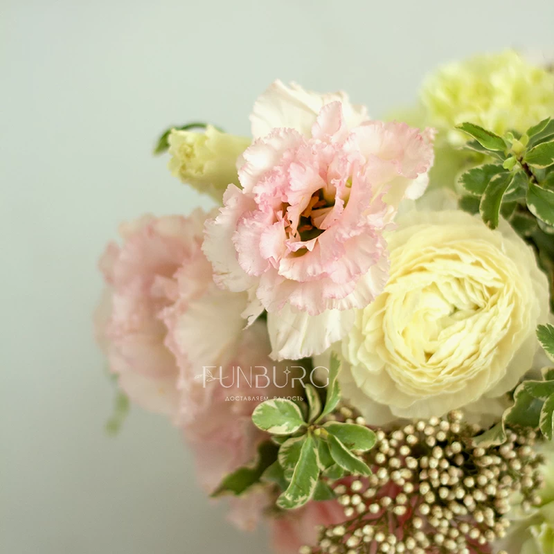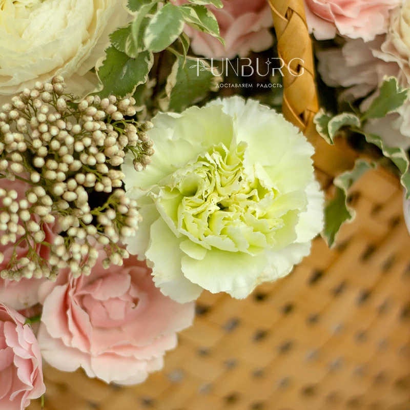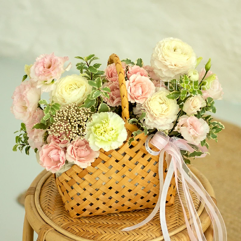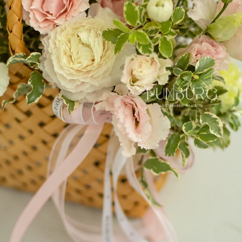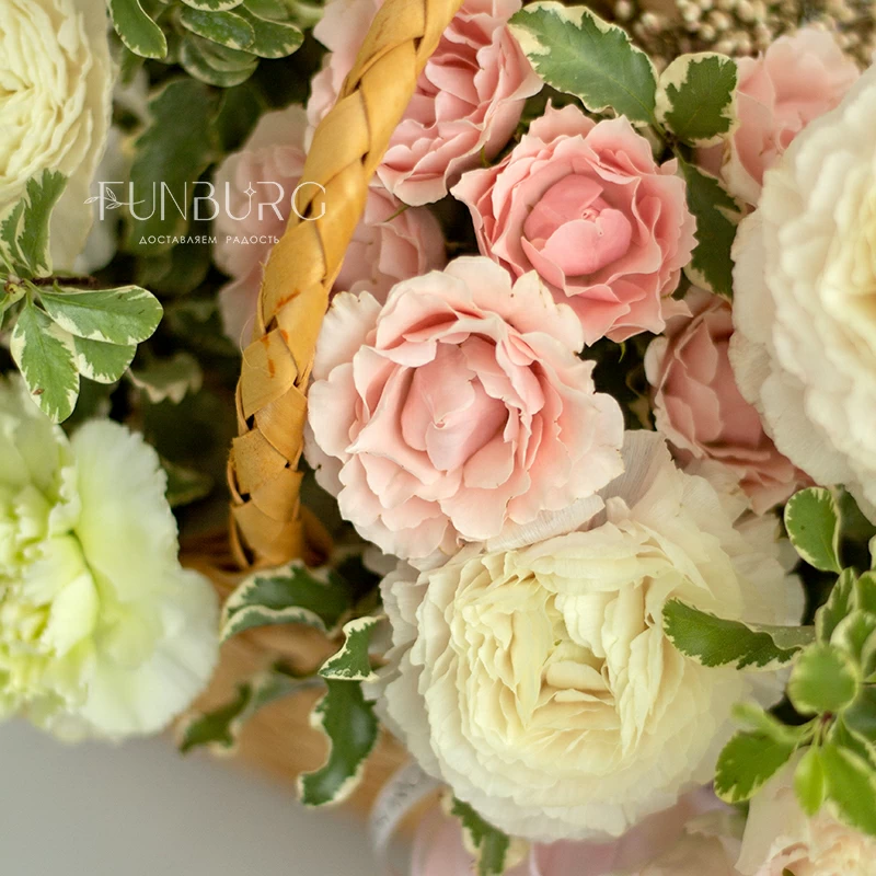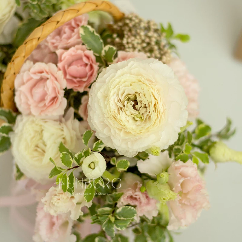 Нежная воздушная композиция из ажурных ранункулюсов, зефирных сливочно-розовых кустовых роз, кружевных салатовых диантусов, жемчужинок озотамнуса и нежных веточек зелени в красивом лукошке. Для самых нежных и теплых сюрпризов.