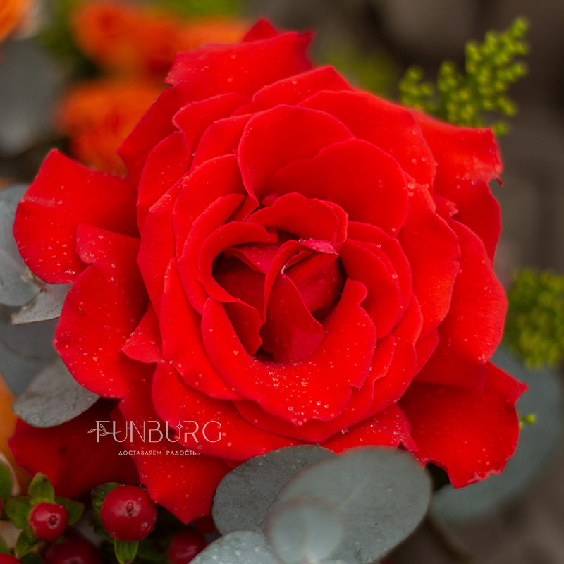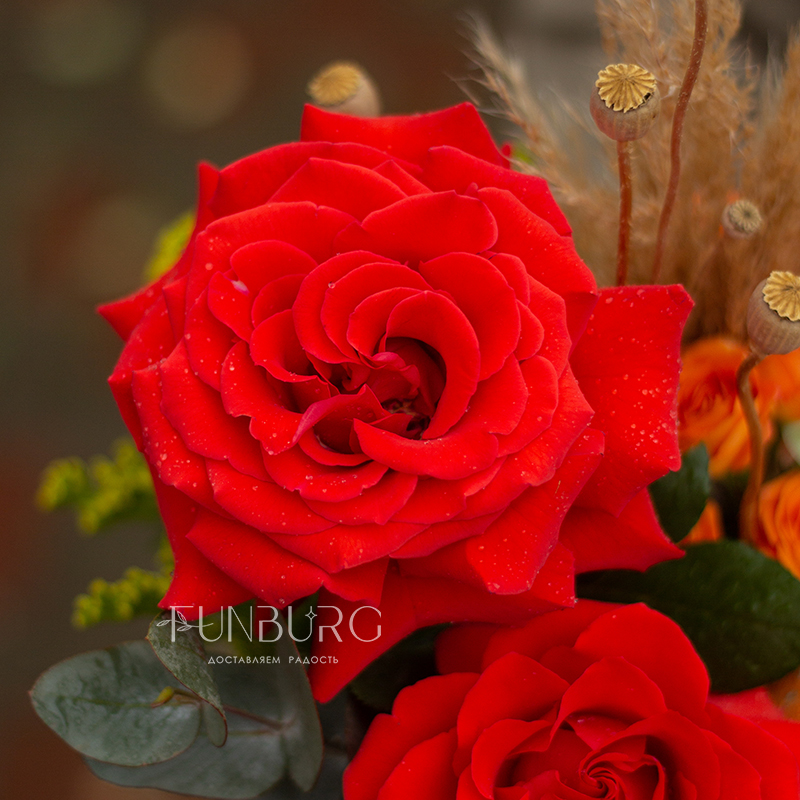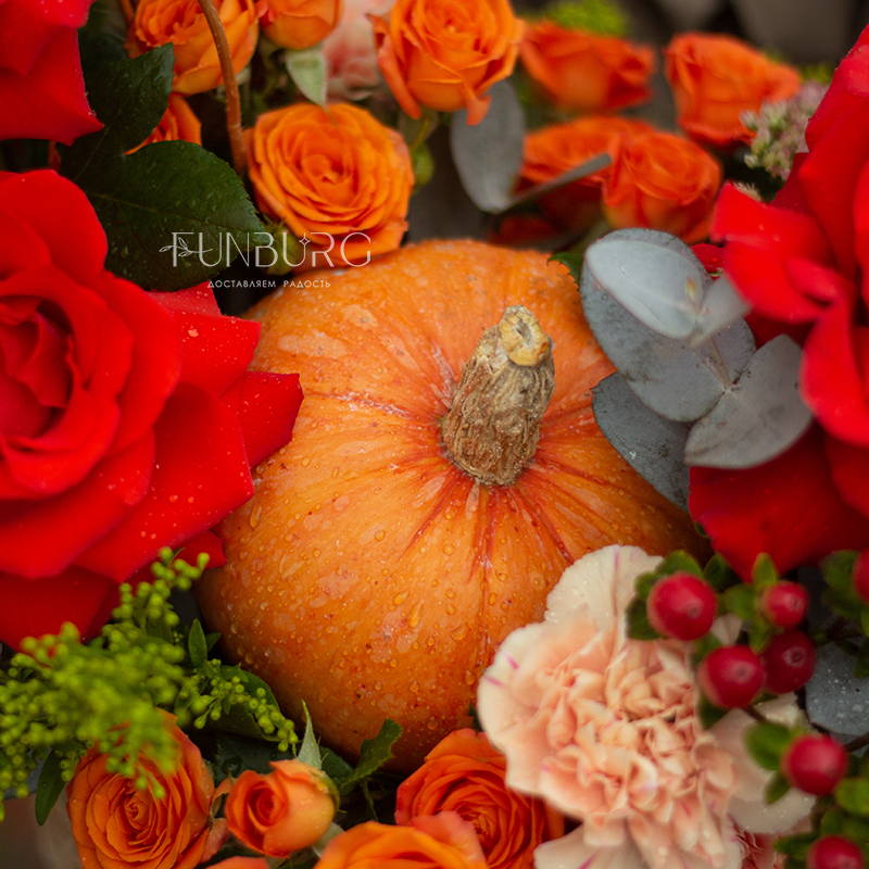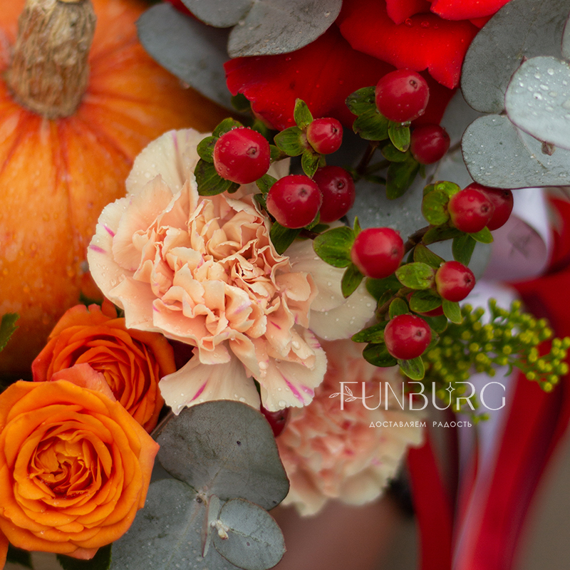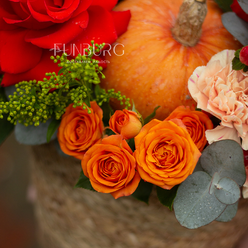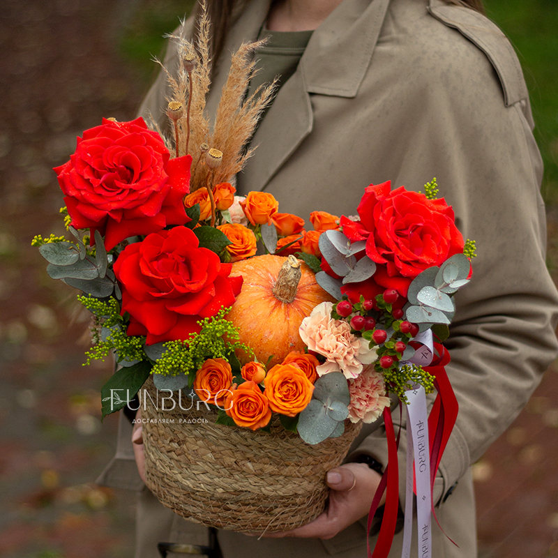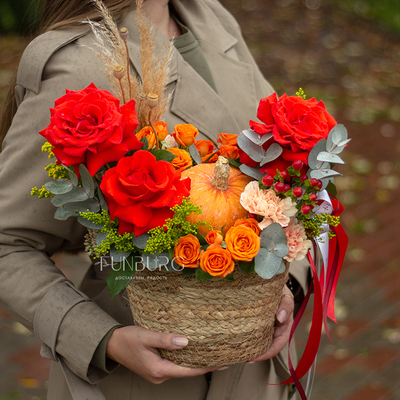 Яркая и сочная корзинка с тыквой, алыми французскими розами, солнечными кустовыми розами, веточками солидаго, ягодами и персиковым диантусом согреет даже в самые прохладные осенние дни!