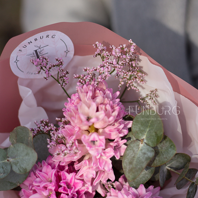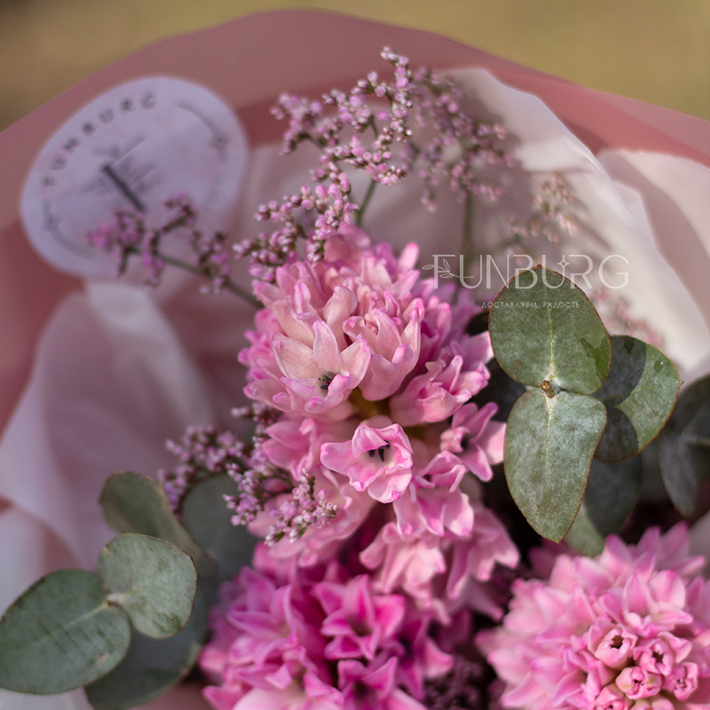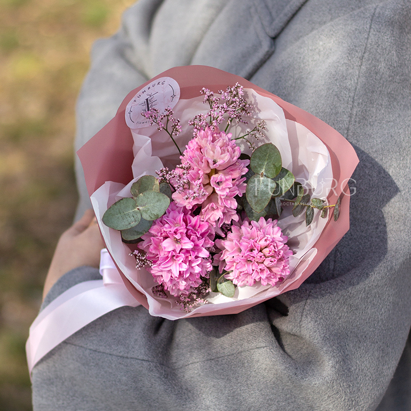 Маленький ароматный букет из душистых розовых гиацинтов и веточек лимониума в тон создан дарить весеннее настроение!