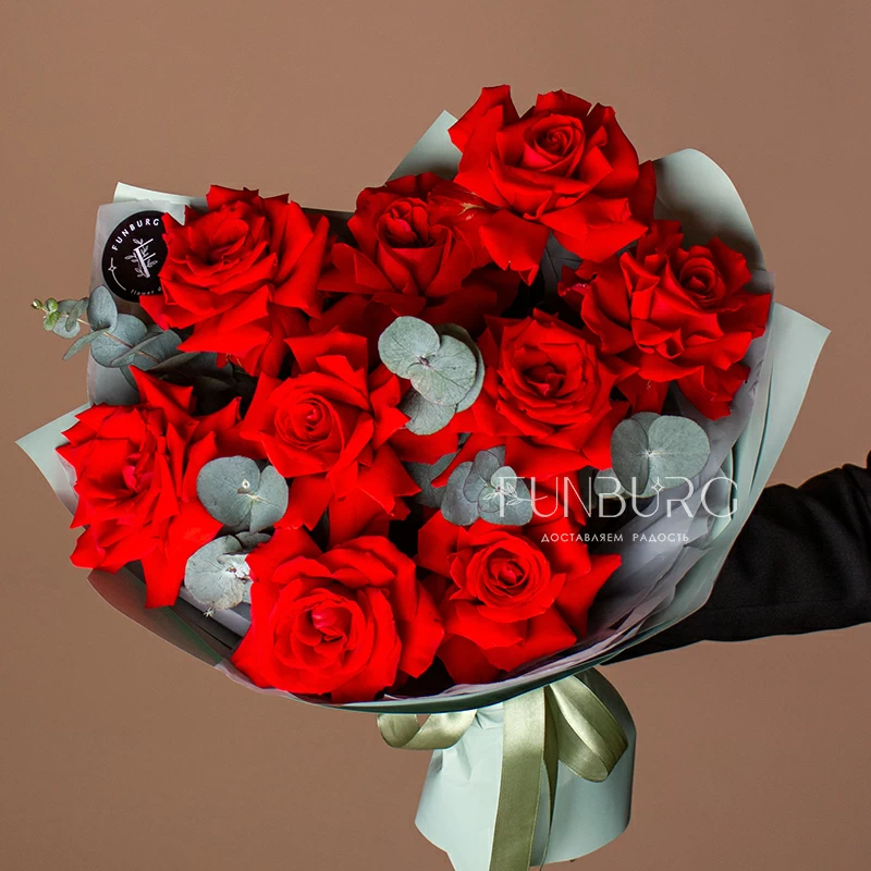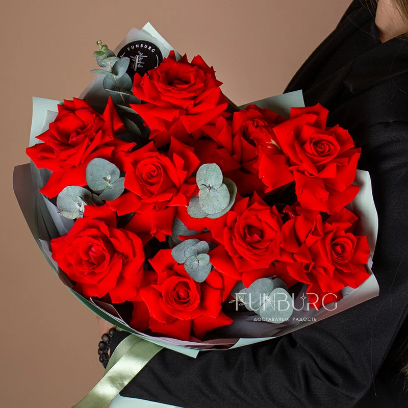Пышный букет из идеальных алых сортовые роз сорта Nina с крупными бутонами ярко-красного цвета, дополненных серебристым эвкалиптом в оттеняющей цветы упаковке. Идеальный букет, чтобы удивить и порадовать самого дорогого человека!