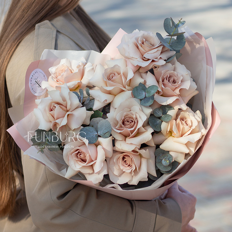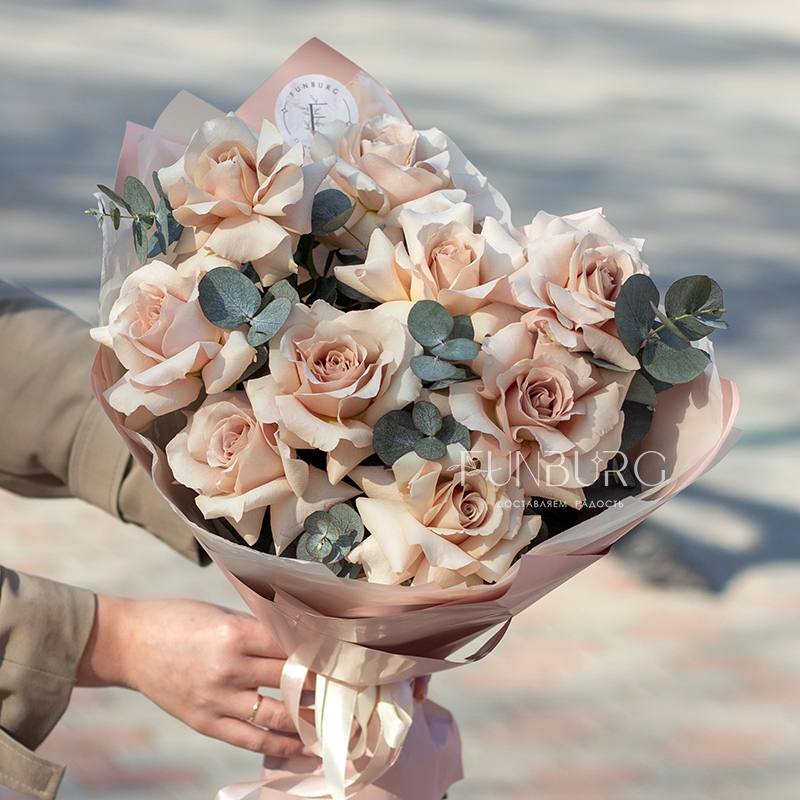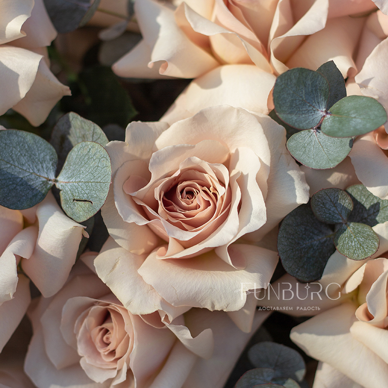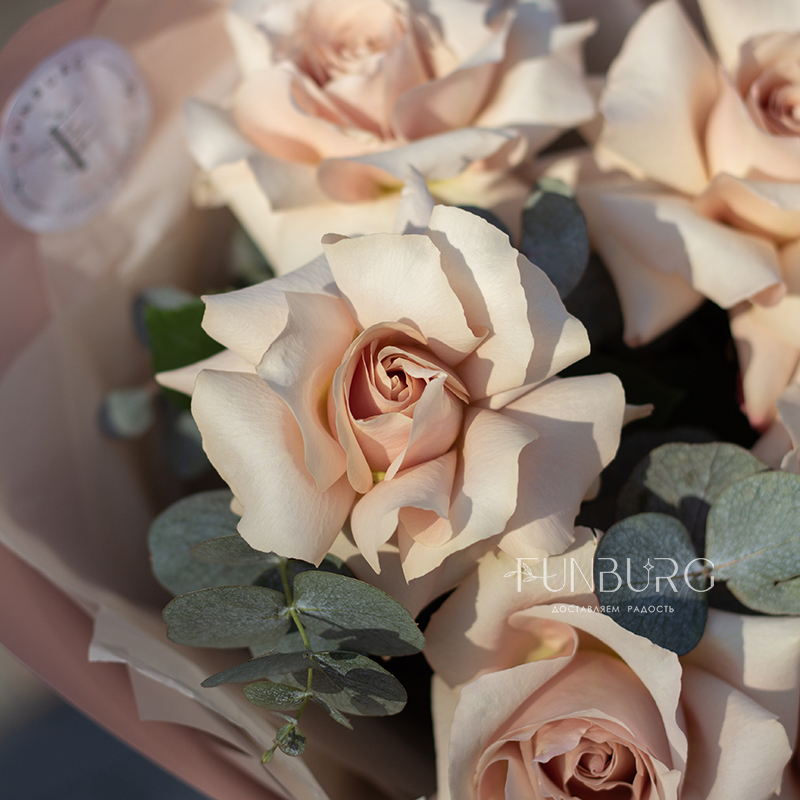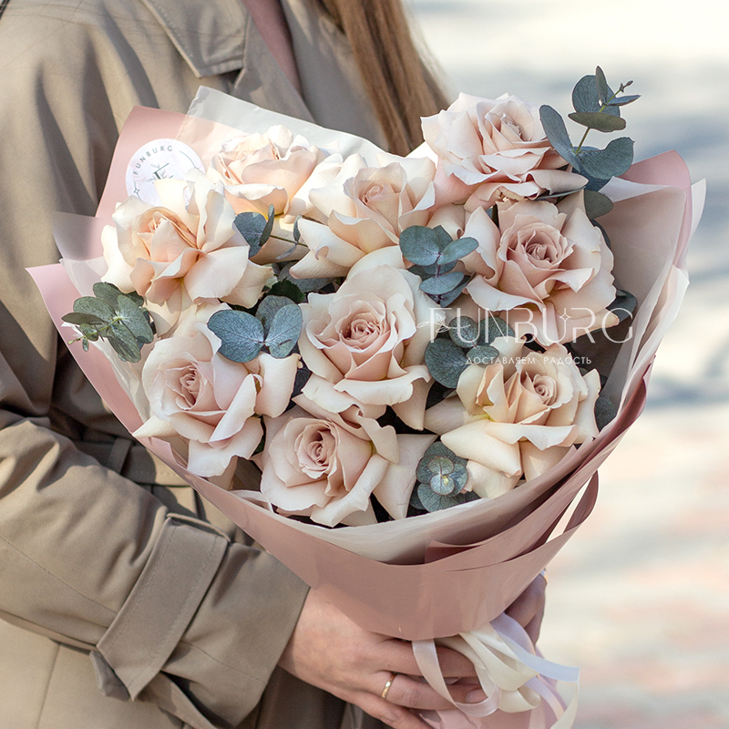Пышный букет из утонченных кремовых французских роз сорта Quicksand с крупными ажурными бутонами, дополненных серебристым эвкалиптом в оттеняющей цветы упаковке. Идеальный букет, чтобы удивить и порадовать самого дорогого человека!