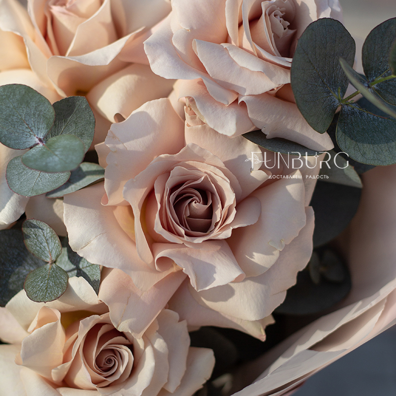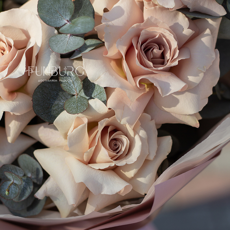 Монобукет из кремовых роз Quicksand с эвкалиптом