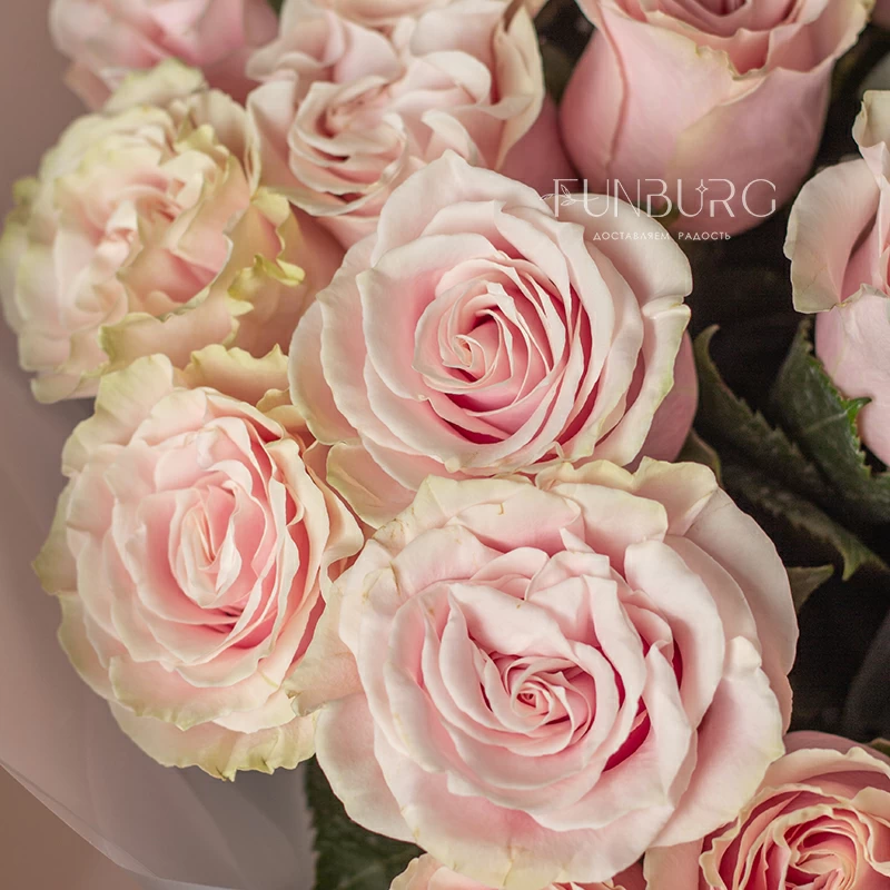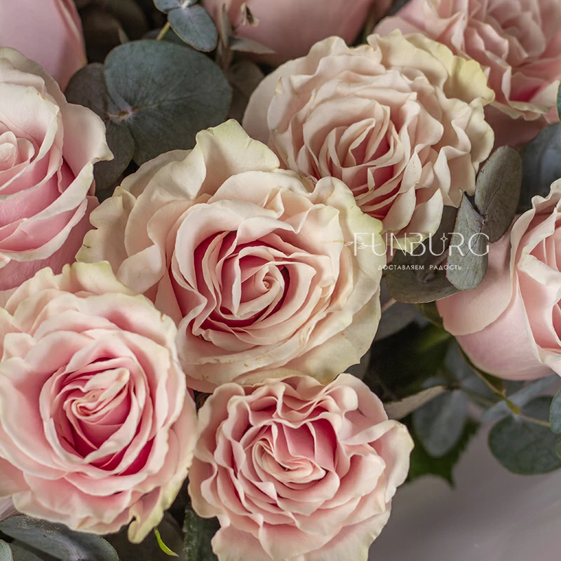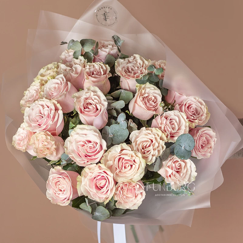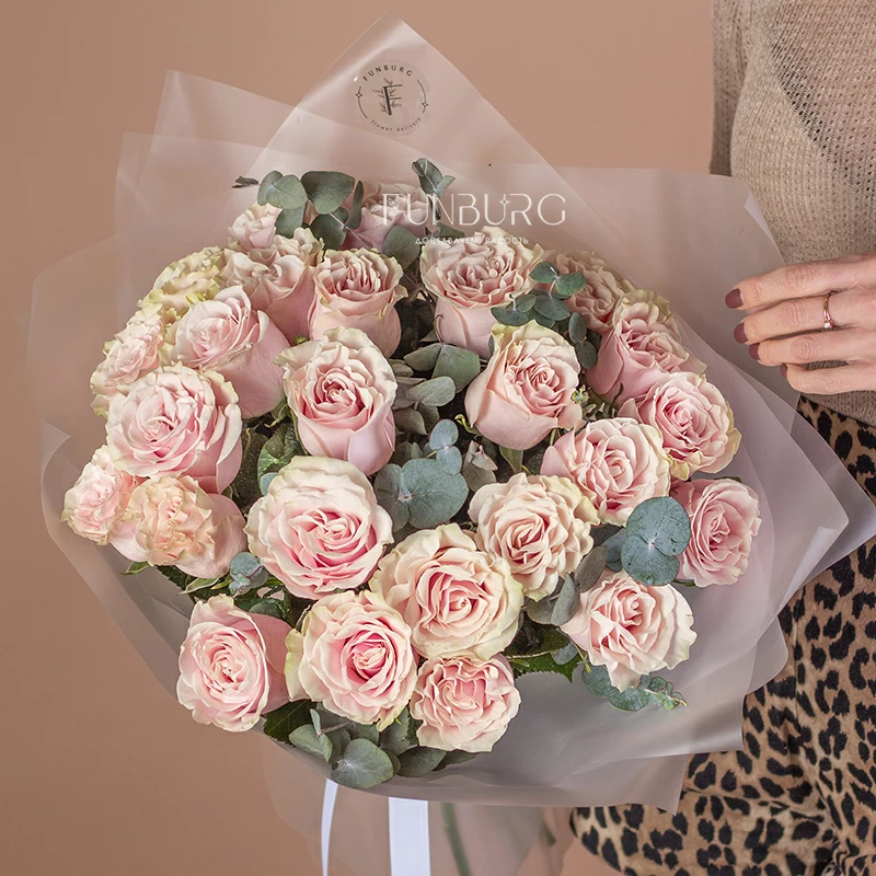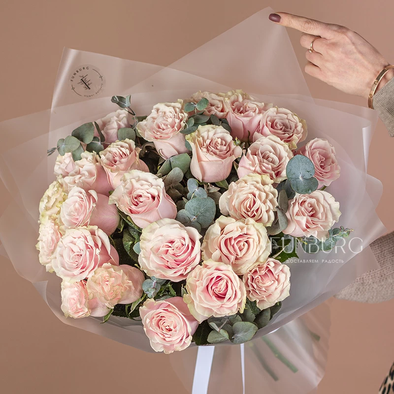 Удивительной красоты букет из нежно-розовых ажурных роз сорта Pink Mondial с кружевными лепестками и веточками серебристого эвкалипта в воздушной полупрозрачной матовой упаковке, подчеркивающей природную безупречность цветов. Со временем бутоны очень красиво раскрываются, завораживая бесчисленным множеством нежных лепестков. Этот букет создан передавать самые нежные и искренние чувства!
