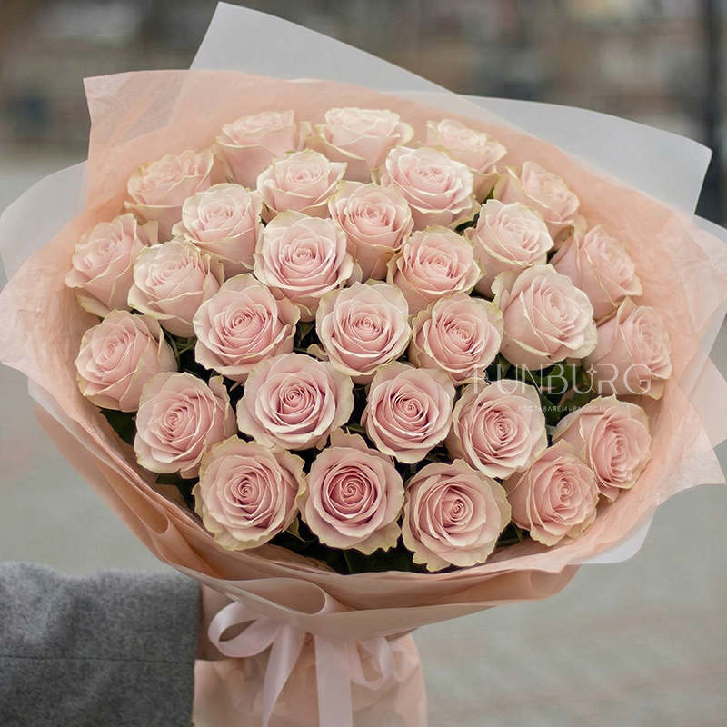 Монобукет из роскошных роз сорта Pink Mondial с красивыми крупными бутонами нежного розового цвета с теплым бежевым подтоном, которые со временем красиво раскрываются (как на последней фотографии), завораживая воздушностью нежных лепестков. Розы этого сорта не только красивые, но и достаточно стойкие, поэтому при правильном уходе будут радовать дольше обычных роз.
