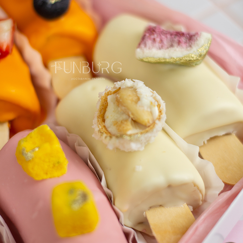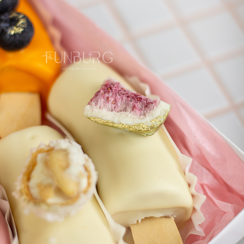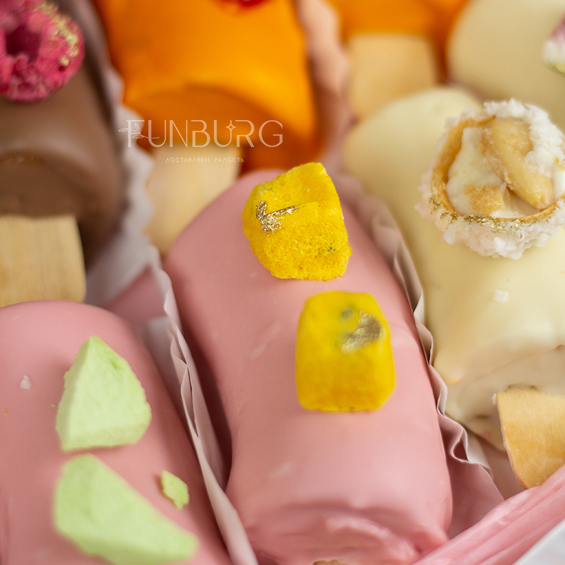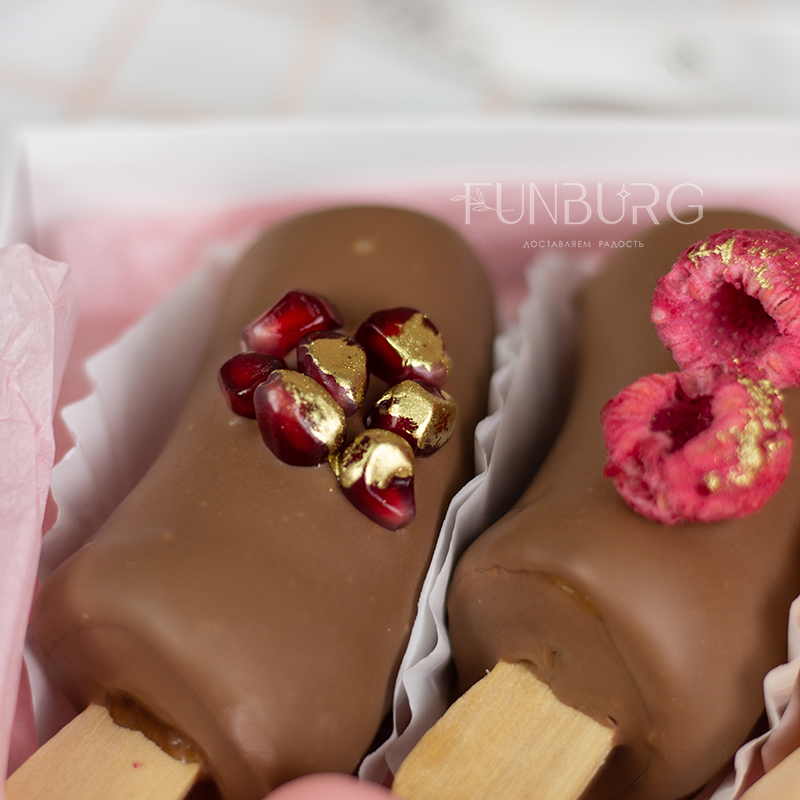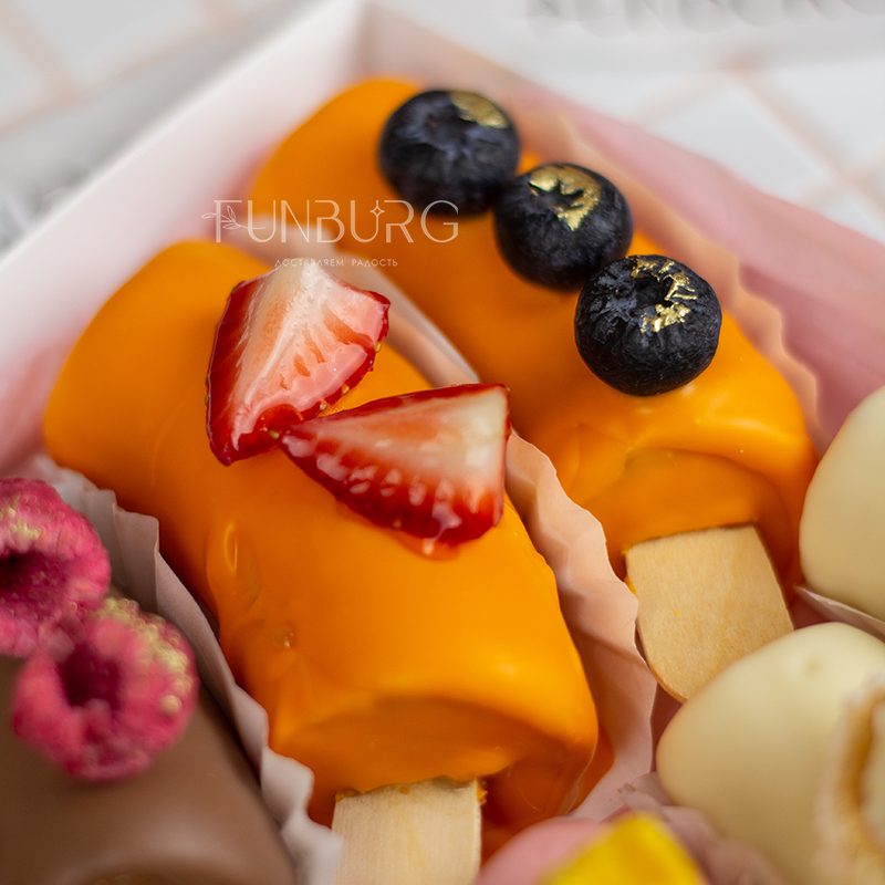 Идеальное сочетание нежной кремовой текстуры сладкого банана и слегка хрустящей оболочки из белого, клубничного, апельсинового и молочного шоколада! Этот бесподобный десерт мы дополнили сублимированным мороженым, сублимированными инжиром, маракуйей, свежей клубникой, гранатом, голубикой. Сладкая фруктовая классика в необычном красивом прочтении станет отличным дополнением к основному подарку или букету цветов.