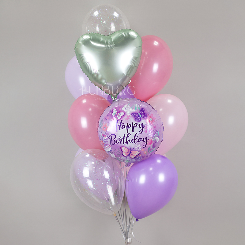 Нежный набор в лавандовых оттенках с красивым кругом с бабочками, сверкающими шариками с конфетти и мятным сердецем в тон рисунку на шаре.