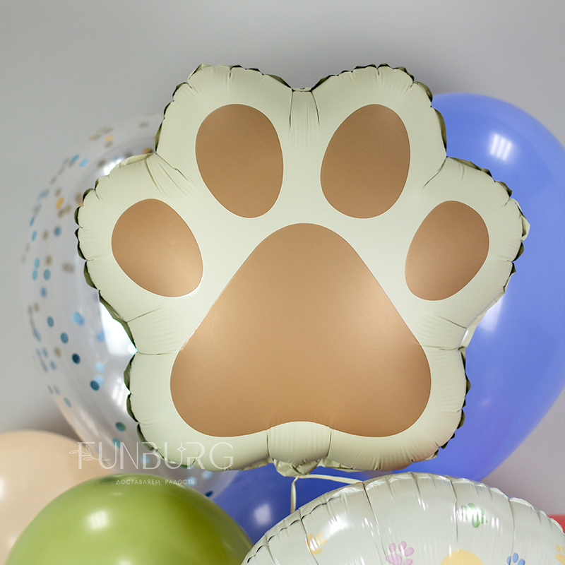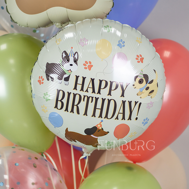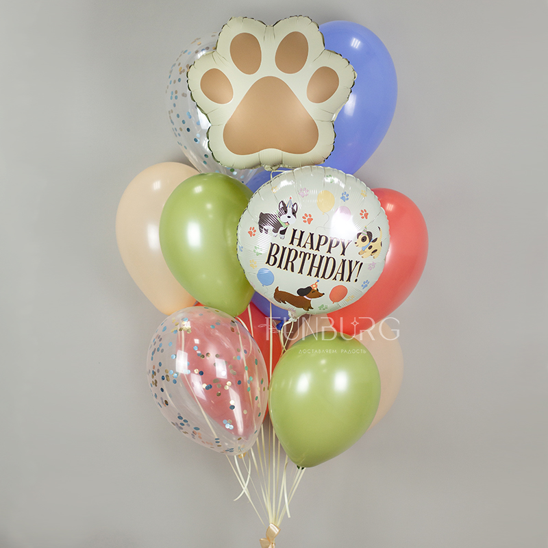 Набор мини-шариков для любителей собачек! В Нем тематический шарик с поздравлением с днём рождения, шарик в виде лапки и идеально подходящие к ним разноцветные шарики.
