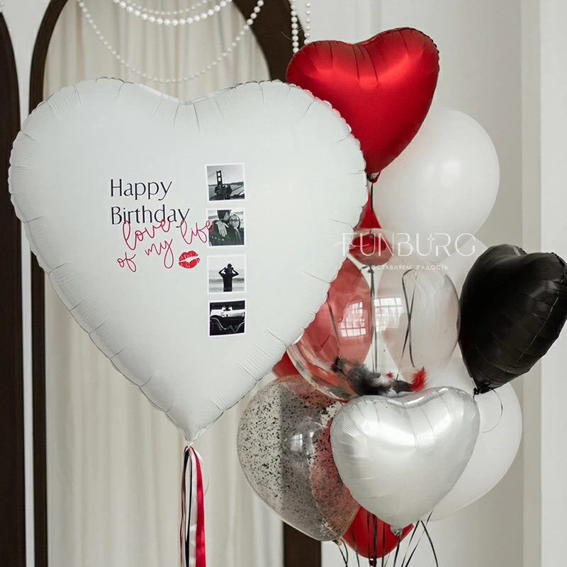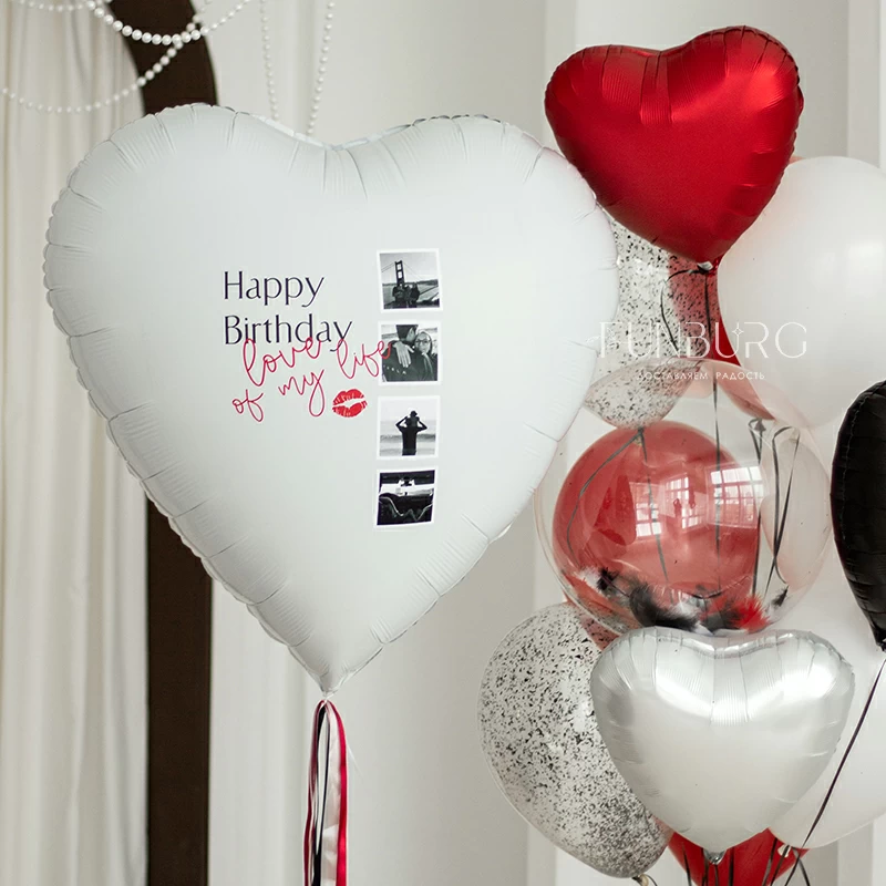 Огромное белоснежное сердце (его диаметр почти 1 метр!) из фольги с уникальным украшением в виде ваших фотографий и надписи станет незабываемым и очень трогательным подарком! Мы придумали дизайн расположения фотографий и надписи, а вам остается только выбрать из своего фотоархива самые ценные и подходящие снимки, придумать надпись (или использовать наш пример) - идеальная валентинка или просто сюрприз для близкого человека готовы!