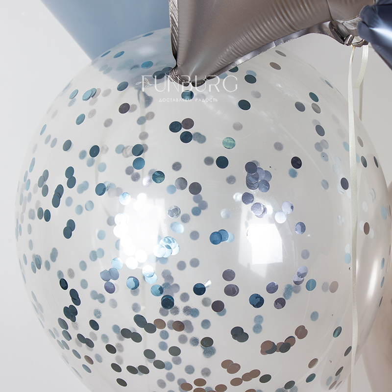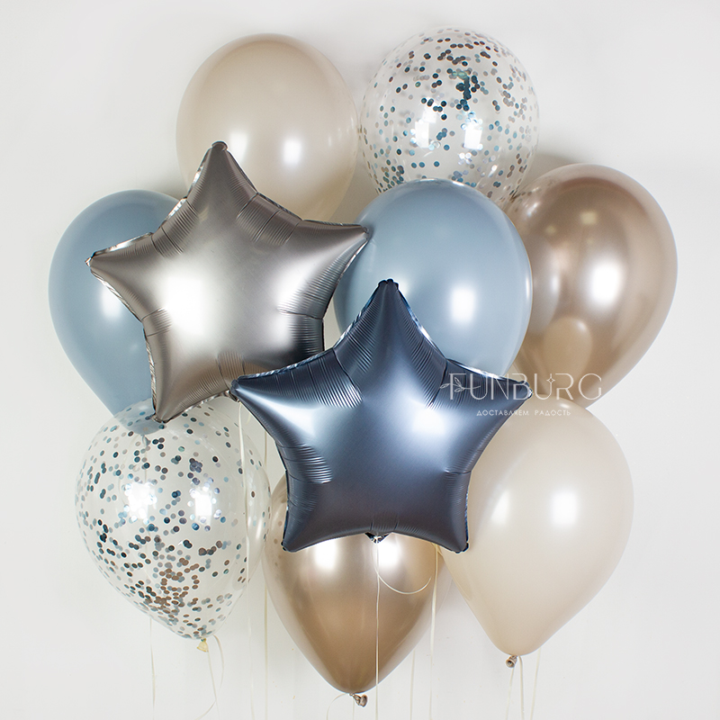 Красивое сдержанное сочетание туманно-голубого, песочного и жемчужного оттенка Chrome, с идеально дополняющими шарики сатиновыми звездами и шариками с конфетти.