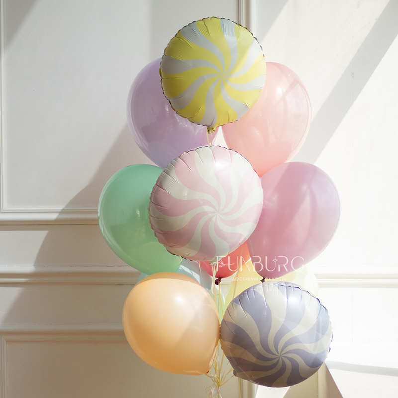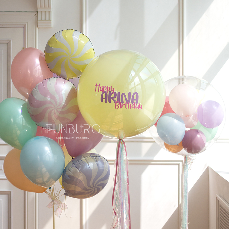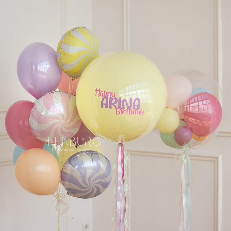 Готовое решение для стильного украшения праздника! В набор входит эффектный большой стеклянный шар сливочно-желтого конфетного оттенка с надписью (она может быть любой) и шлейфом из ленточек, шар Bubble с шариками внутри и связка шариков с кругами карамельками. Идеально для поздравления маленьких и больших сладкоежек. Каждый элемент (большой шар, bubble и связка) стоят на отдельных грузах, поэтому их легко перемещать и размещать так, как того требует пространство, а еще с ними так очень удобно фотографироваться!