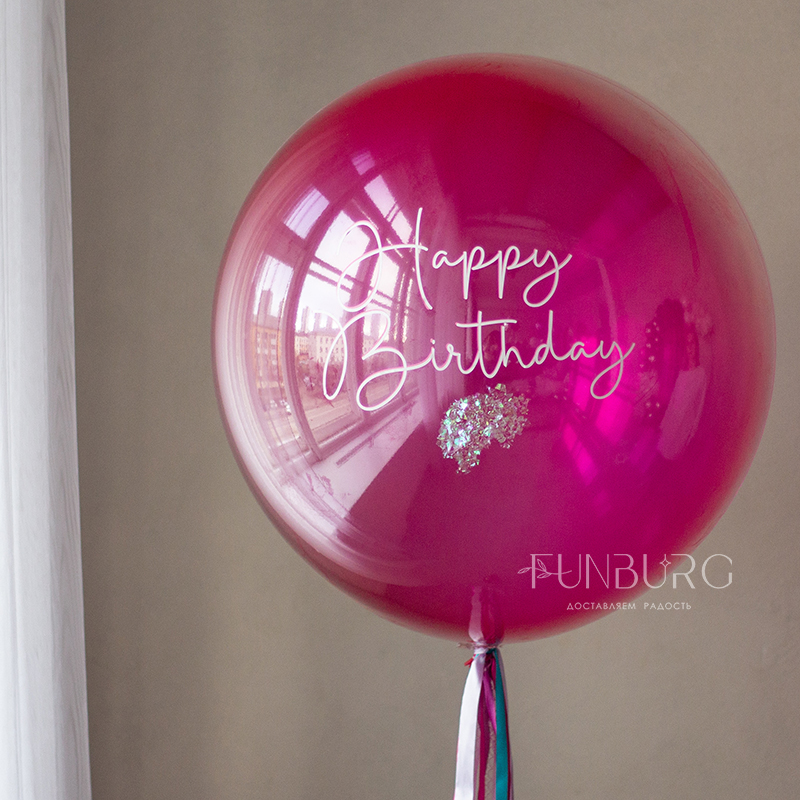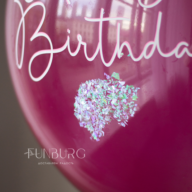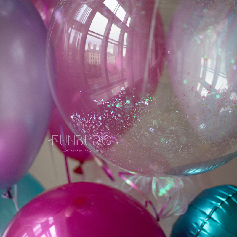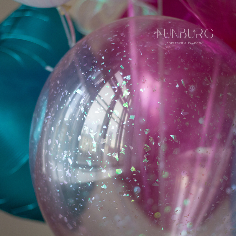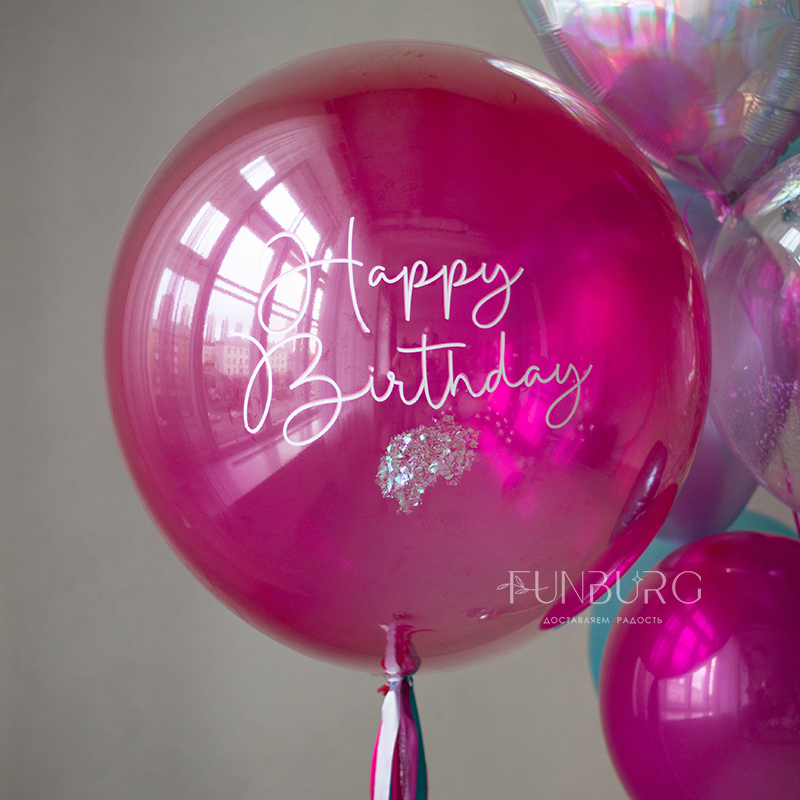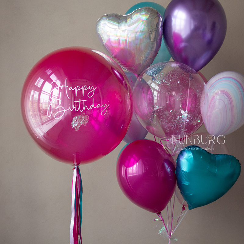 Большой глянцевый шар насыщенного ярко-розового полупрозрачного, как леденец, оттенка, с лаконичной надписью и оформлением сверкающим конфетти и шлейфом из ленточек. Идеально для поздравления тех, кто любит яркое и эффектное! Шар мы дополнили не менее эффектной, идеально дополняющей его связкой бирюзово-розовых и пурпурных оттенков, со сверкающими конфетти и переливающимся сердцем.