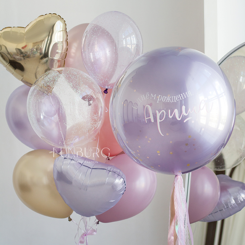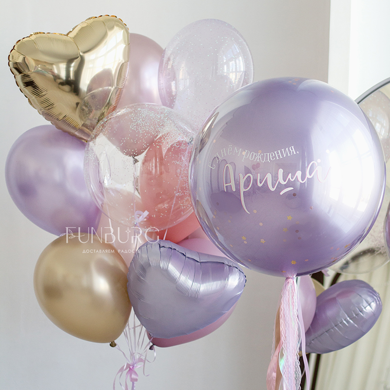 Большой зеркально-глянцевый мерцающий шар завораживающего сиреневого оттенка коллекции Silk с конфетти, шлейфом из ленточек и надписью мы дополнили идеально подходящей к нему связкой в мерцающих розовых, лавандовых и золотистых оттенках. Напоминает сказку о подводном мире! Идеально для поздравления той, в чьем сердце живет сказка!