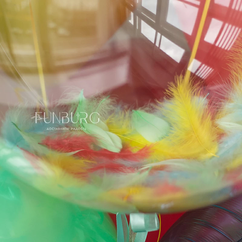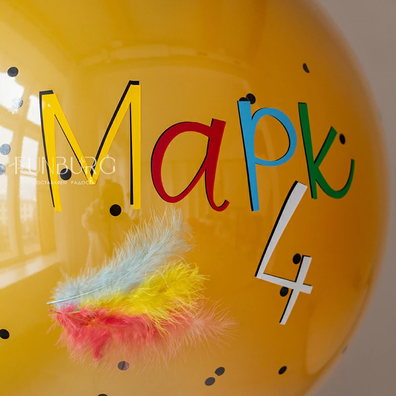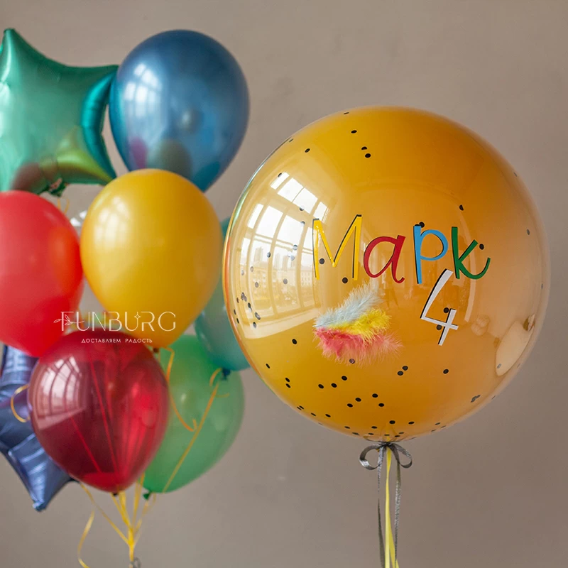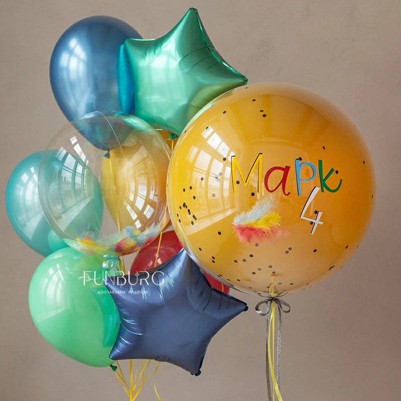 Готовое решение для стильного и необычного украшения или подарка на день рождения! В набор входит большой стеклянный шар с надписью (ее можно сделать любой), украшенный лентами и перышками, и связка из шариков разного типа и размера с прозрачным шаром bubble с разноцветными перьями. Каждый элемент (большой шар и связка) стоят на отдельных грузах, поэтому их легко перемещать и размещать так, как того требует пространство, а еще с ними так очень удобно фотографироваться!