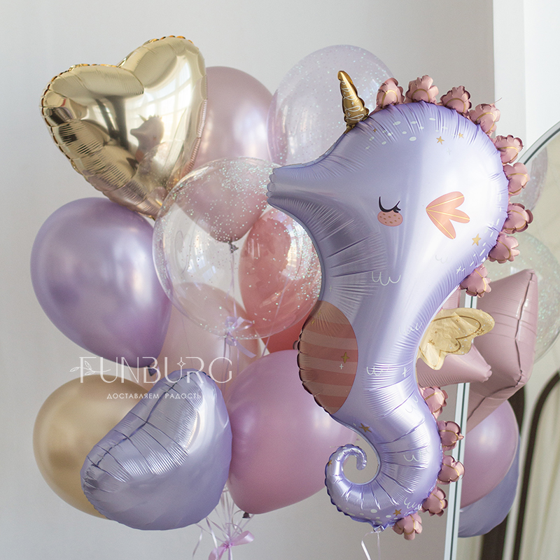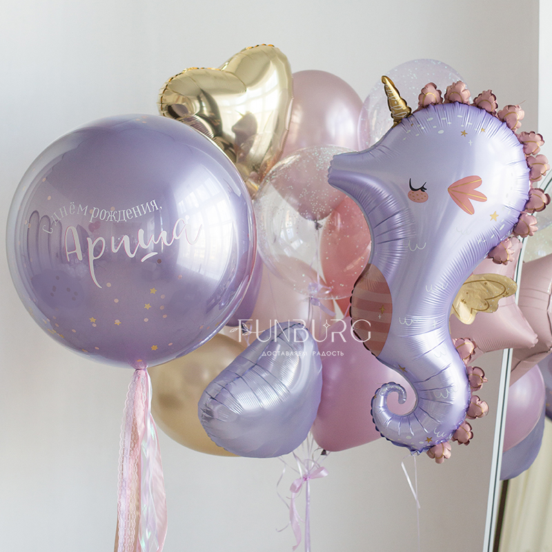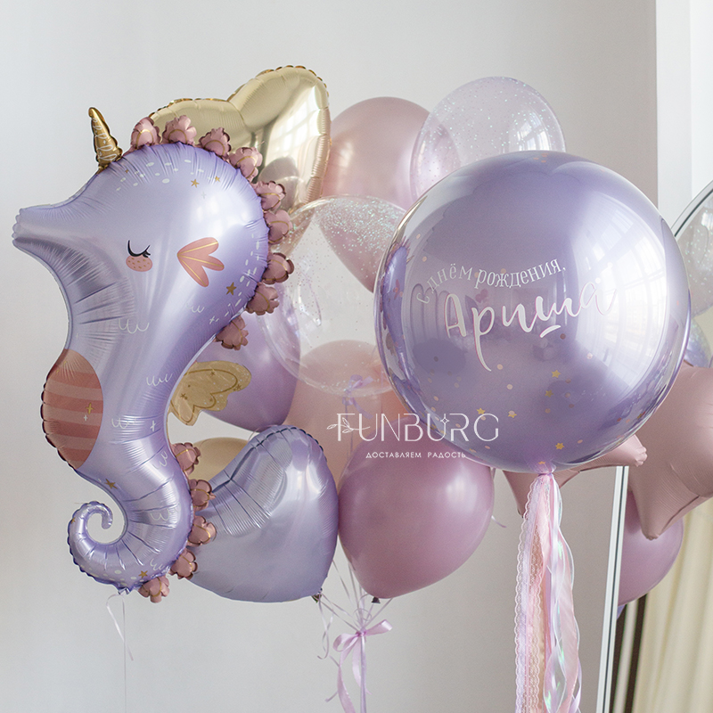 Готовое решение небольшого оформления праздника или фотозоны: волшебный сатиновый морской конёк, большой зеркально-глянцевый шар красивого мерцающего лавандового оттенка с конфетти, шлейфом из ленточек и надписью (ее можем сделать любой), идеально подходящая к ним связка из шариков, напоминающая пузырьки и сказочный подводный мир. Состав набора вы можете менять по вашему желанию.