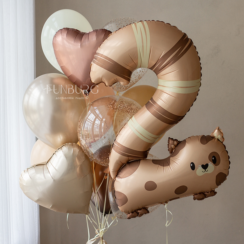 Готовый стильный набор для украшения праздника или подарка на день рождения! Красивая сатиновая цифра 2 в форме милого котёнка и связка шариков под цвет, с шаром Bubble с конфетти и сердечками.