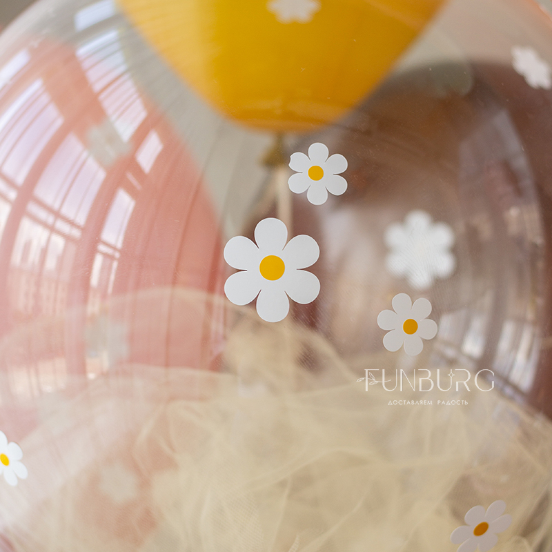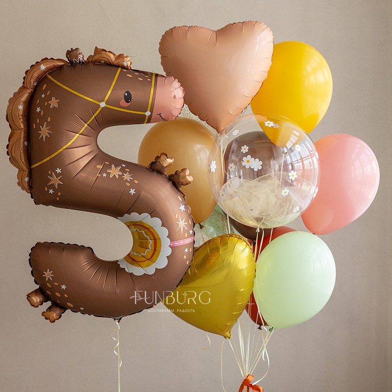 Готовый набор для украшения праздника или подарка на день рождения: красивая сатиновая цифра 5 в форме лошадки и тематическая связка шариков под цвет, с нежным шаром Bubble с фатином и россыпью ромашек.