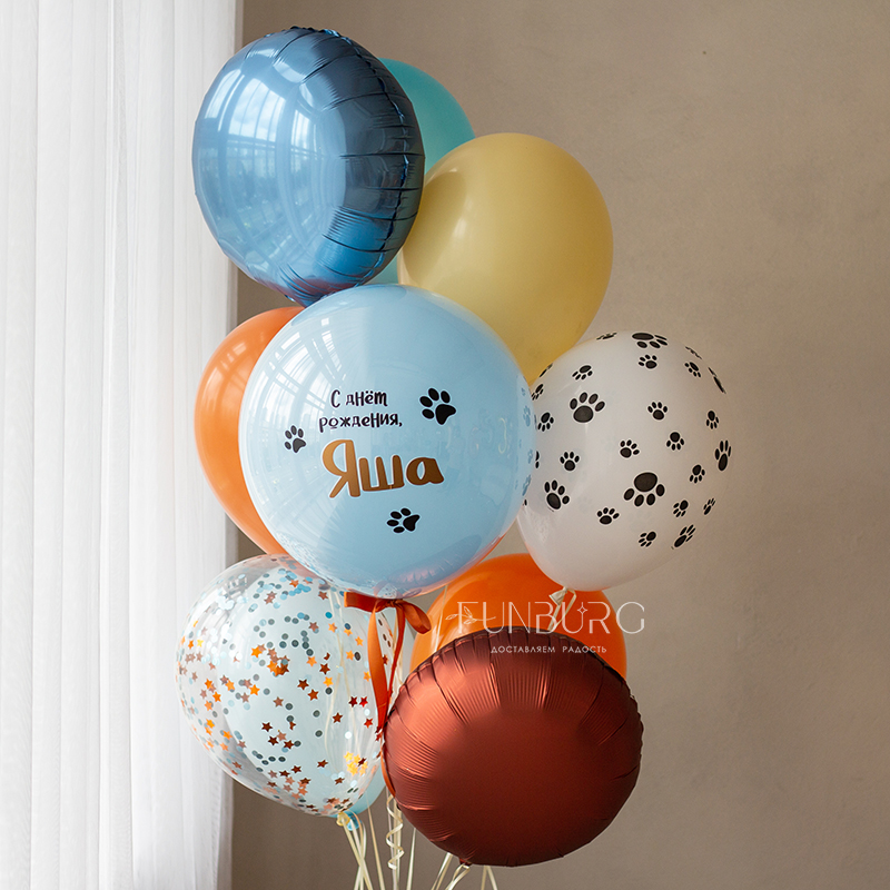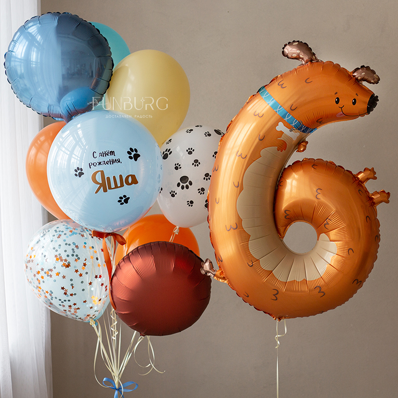 Готовый набор для украшения праздника или подарка имениннику: красивая яркая цифра 6 в форме собачки и тематическая связка шариков под цвет с стеклянным шаром с надписью. Надпись на шаре можно сделать любой.