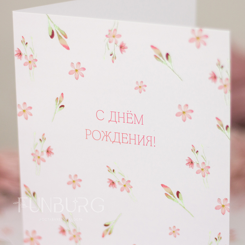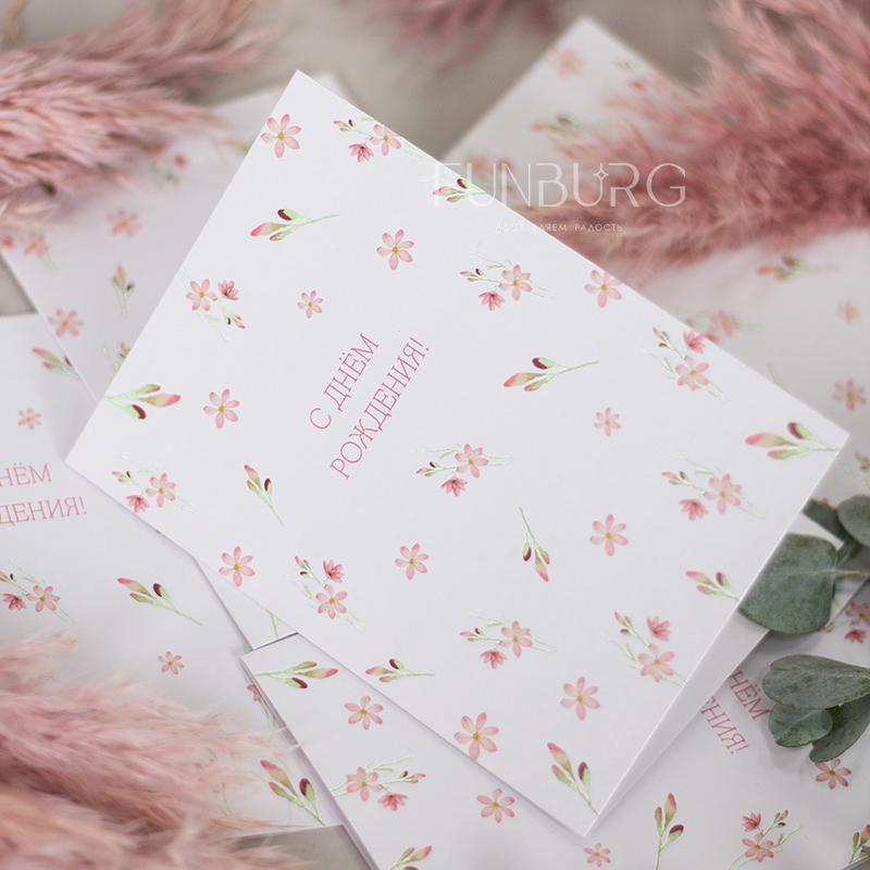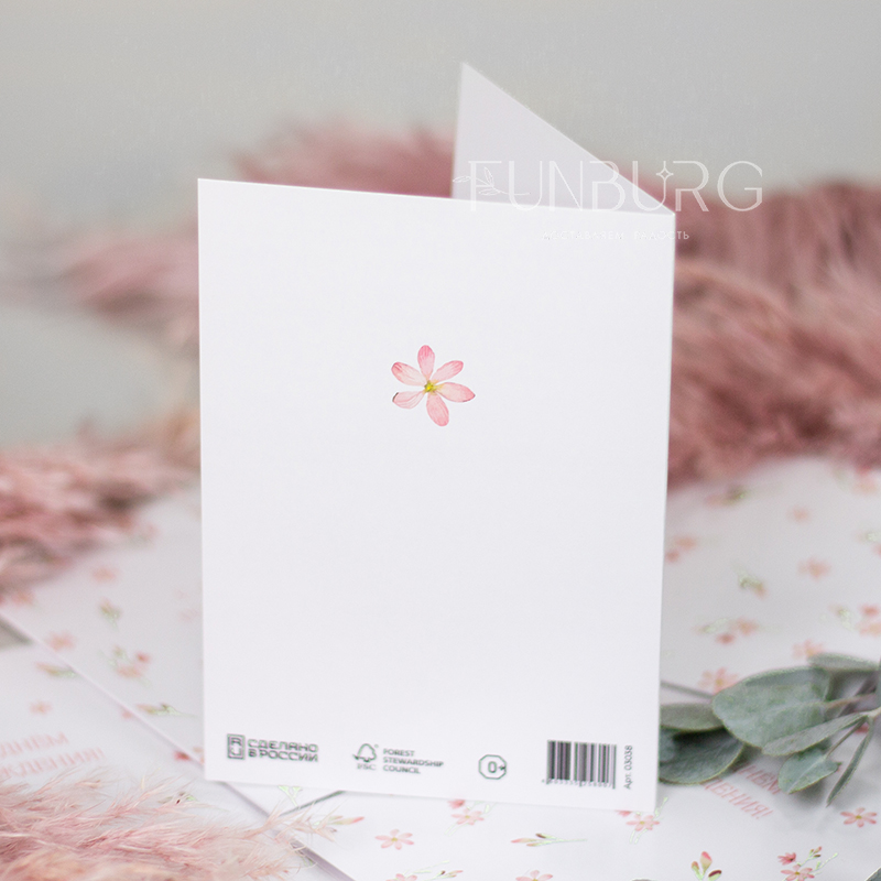 Красивая открытка с нежным принтом в виде акварельных миниатюрных цветочкой. Внутри открытки нет заранее написанных пожеланий, чтобы вы могли сами добавить несколько важных строк, которые будут гораздо ценнее любого даже самого красивого готового текста-поздравления.