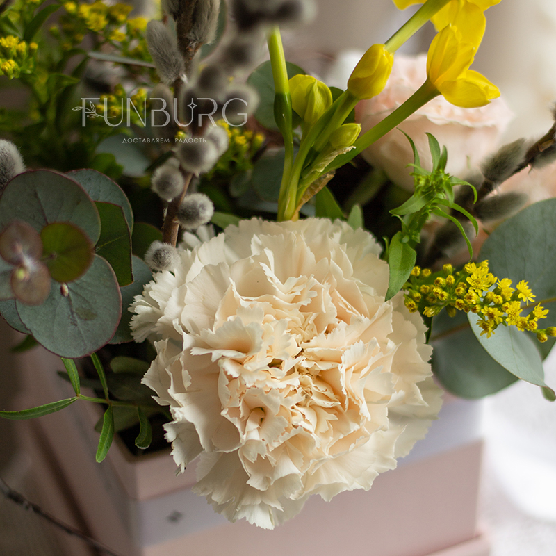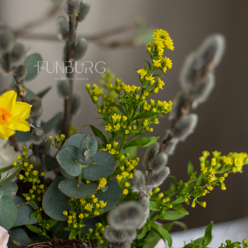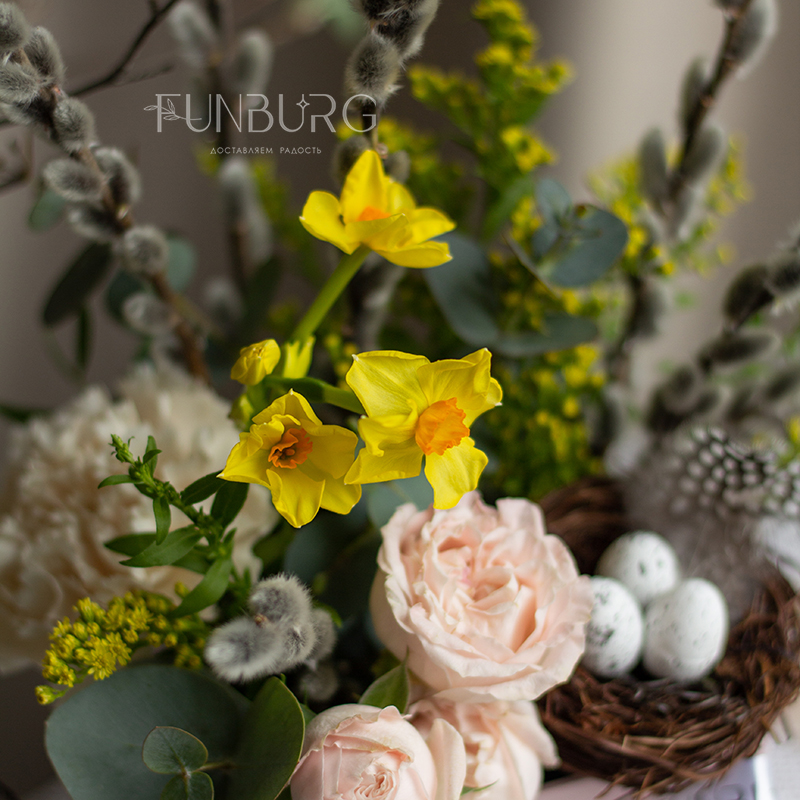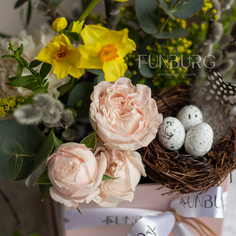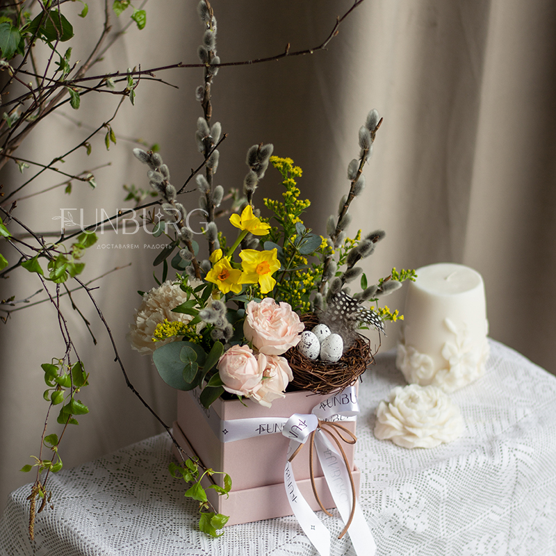 Невероятно весенняя небольшая пасхальная композиция в квадратной коробочке с веточками вербы, ароматными нарциссами, пионовидной кустовой розой, диантусом и декоративным гнёздышком. Ею можно украсить праздничный стол, или приподнести ее в качестве подарка на Пасху.