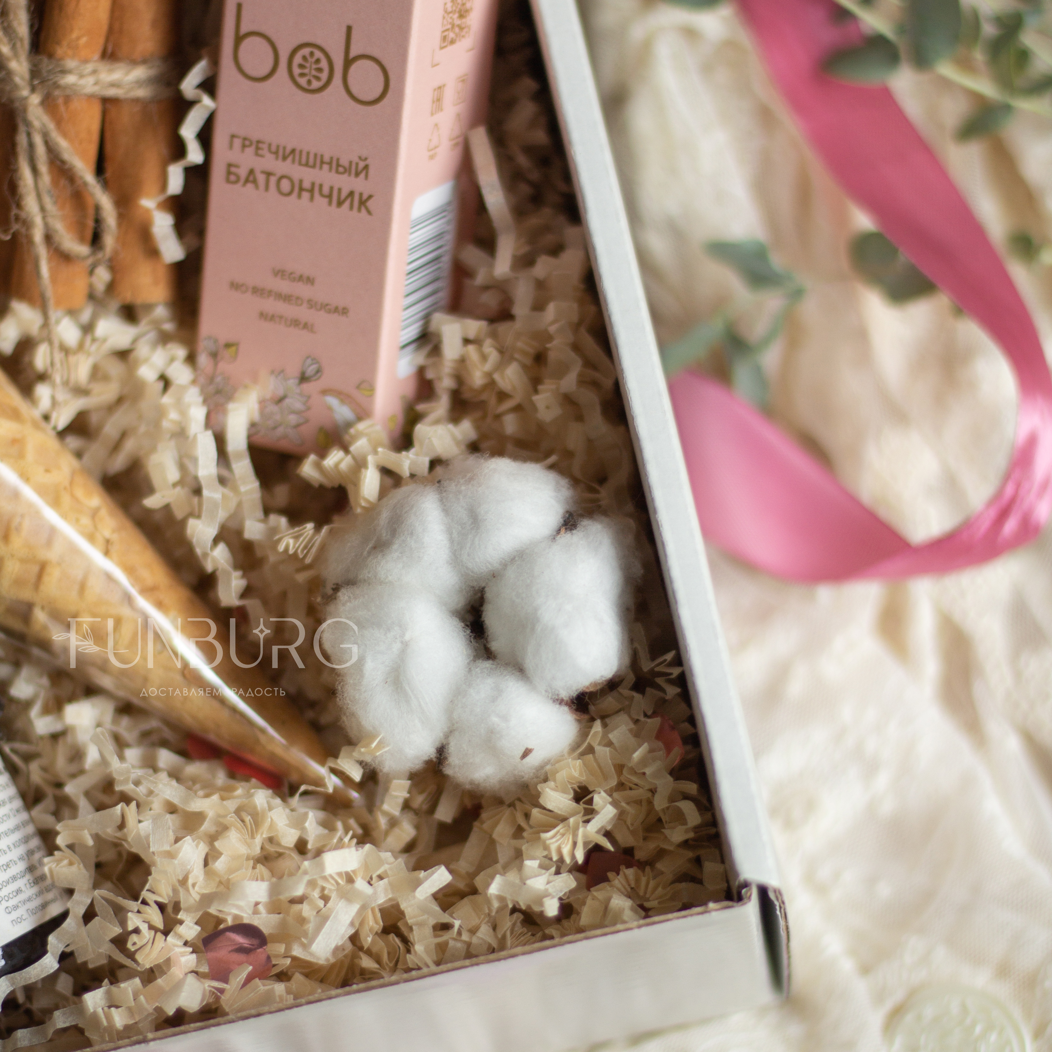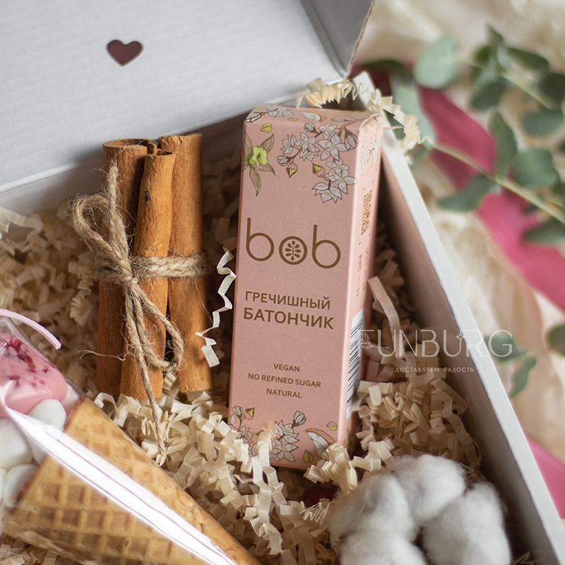 Нежный подарочный набор радостей для души! В нем воздушный зефир Marshmallow и сердечки из клубничного шоколада в вафельном рожке, винный джем, натуральный гречишный батончик, букетик из сухоцветов, палочки корицы и нежное соцветие хлопка для настроения!