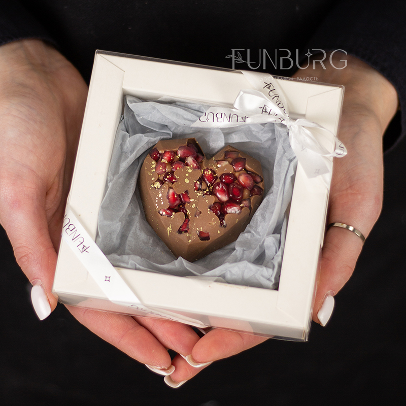 Сердце из вкуснейшего бельгийского молочного шоколада с сочными зёрнами спелого граната, которые так ярко оттеняют нежную текстуру и сладость шоколада! Десерт, который точно стоит попробовать!