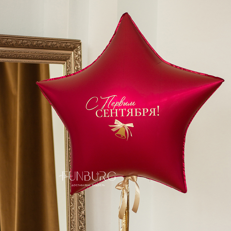Большая (ее диаметр почти 1 метр!) сатиновая звезда глубокого вишневого оттенка с золотистой гирляндой и надписью идеально подходит для украшения Первого сентября и поздравления учеников и студентов! А если поменять надпись (она может быть любой), звезда подойдет практически для любого торжества и поможет создать особенную праздничную атмосферу.