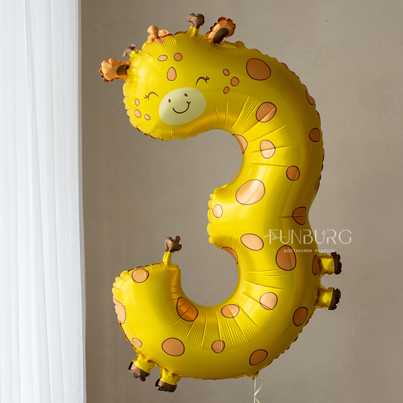 Яркая красивая цифра в виде милого жирафика идеально подойдет для третьего дня рождения или для празднования трех месяце с рождения малыша.