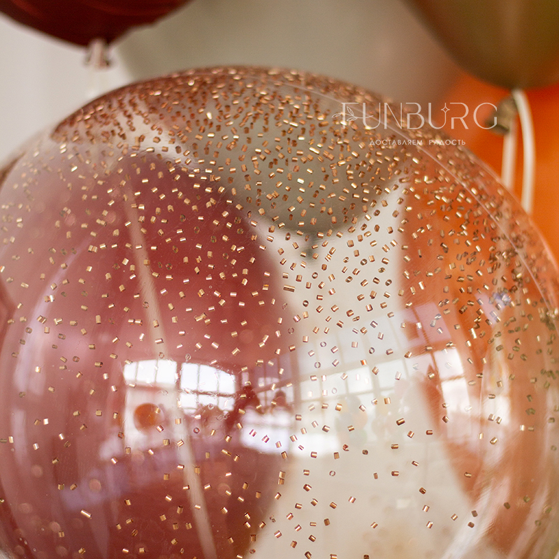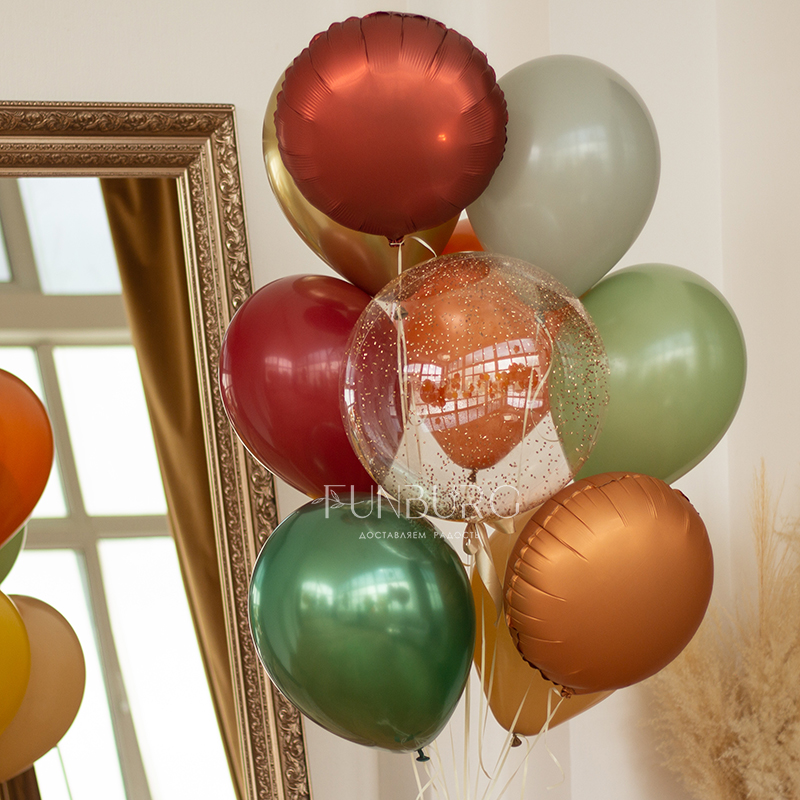 Красивая связка шариков в теплых согревающих цветах золотой осени! В ней мы собрали классические матовые и мерцающие шарики Chrome, сатиновые круги и Bubble со сверкающими конфетти, а для завершенности перевязали связку лентой. Идеально для теплых поздравлений и стильного украшения праздника.
