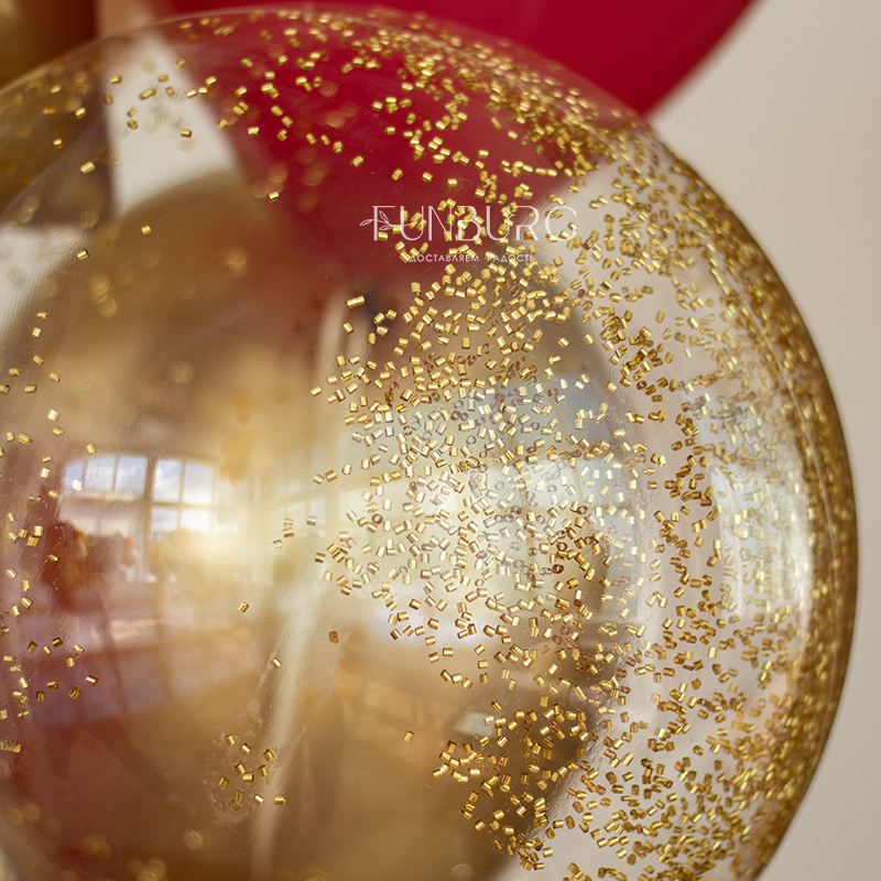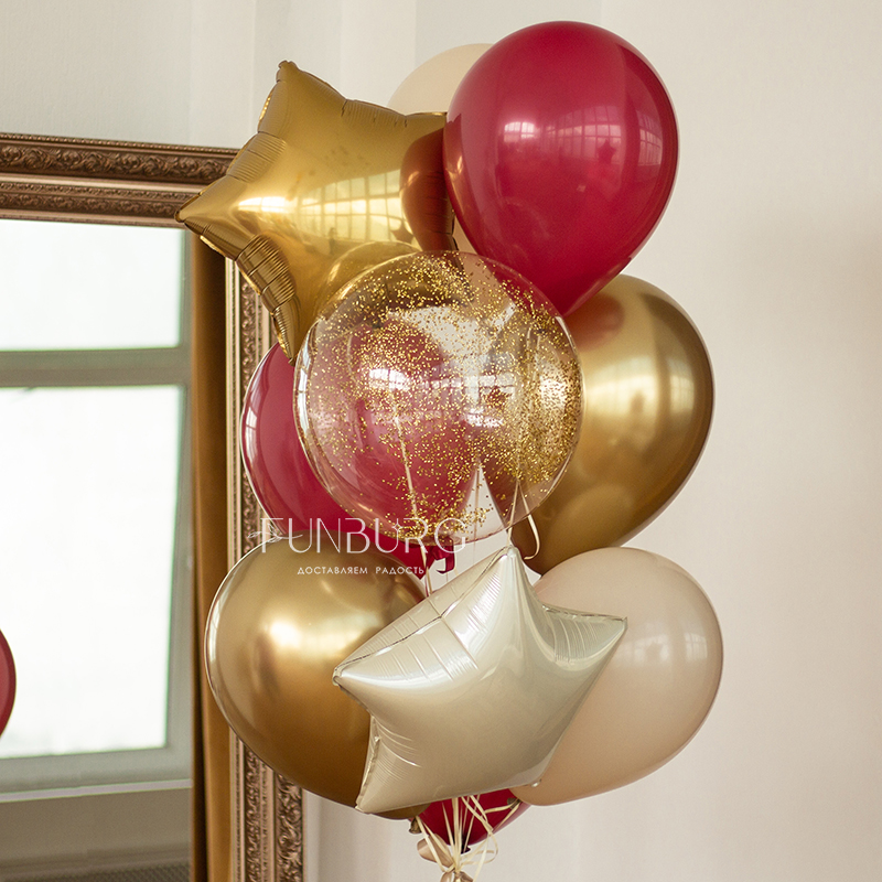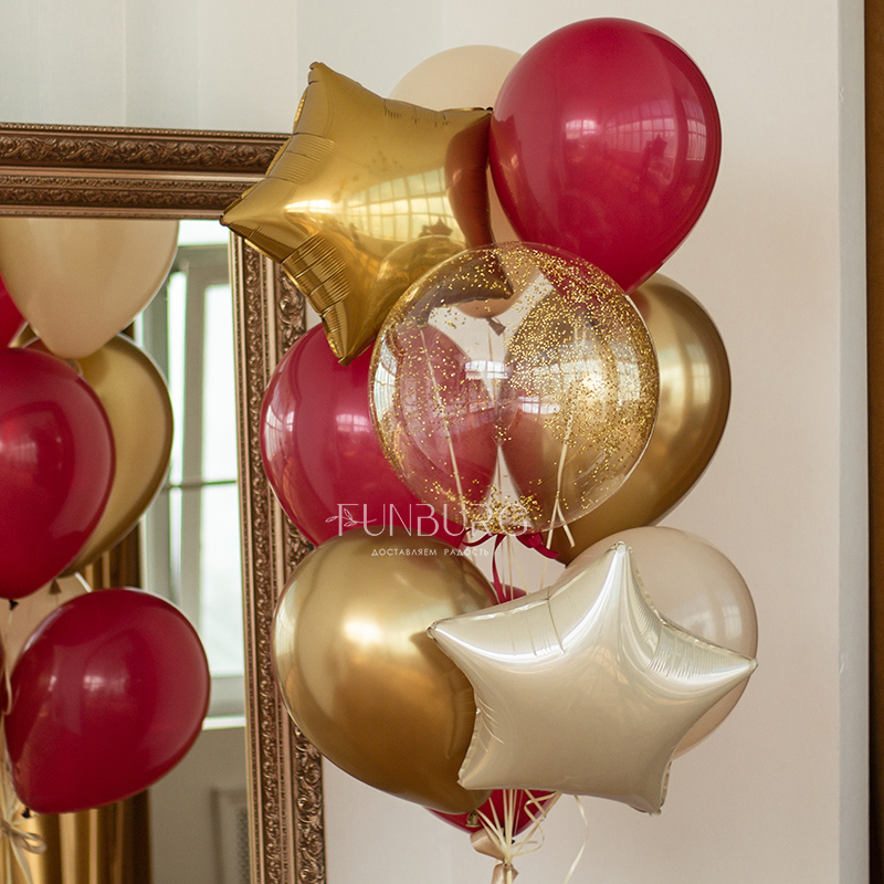 Красивая праздничная связка шариков изысканных бордовых, кремовых и сиющих золотых оттенков. В ней мы собрали классические матовые и мерцающие шарики Chrome, звезды в тон и Bubble со сверкающими золотыми конфетти, а для завершенности перевязали связку лентой. Идеально для особенных поздравлений и стильного украшения праздника.