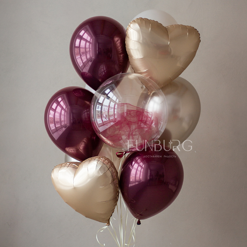 Невероятное сочетание глянцевых насыщенных вишнёвых, кремовых и мягко мерцающих золотистых шариков, с шаром bubble с винным фатином и сердцами.