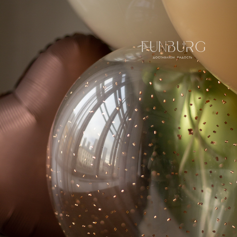 Стильная связка в уютных и модных и свежих оттенках фисташкового, шоколадного и кремового. Надпись на центральном стеклянном шаре можно сделать любой.