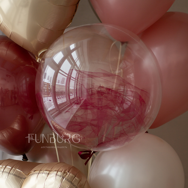 Красивая связка в изысканных оттенках винного, кремово-золотистого и пудрового, с шаром bubble с фатином, глянцевыми, блестящими и матовыми шариками, мерцающими сердцами в тон.