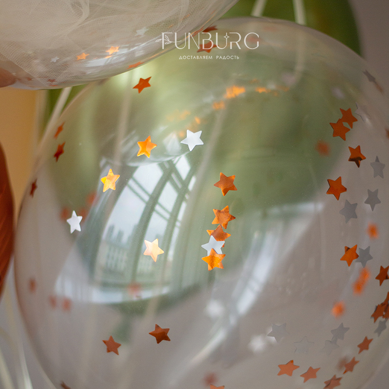Красивая связка шариков в теплых уютных янтарно-кремовых оттенках с добавлением салатового. В ней мы собрали классические матовые и мерцающие шарики Chrome, сатиновые сердца в тон и Bubble с облачком воздушного кремового фатина, а для завершенности перевязали связку лентой. Идеально для особенных поздравлений и стильного украшения праздника. А еще эта связка идеально дополнит большой стеклянный шар «Солнышко».