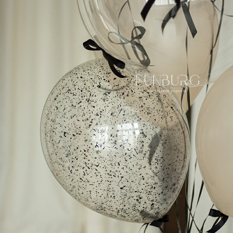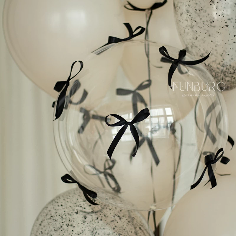 Небольшая связка кремовых шариков с контрастными черными бантиками, с шаром Bubble с бантиками и шариками с конфетти. Это, ставшее уже классическим, сочетание идеально дополнит подарок и украшение праздника в том же стиле.