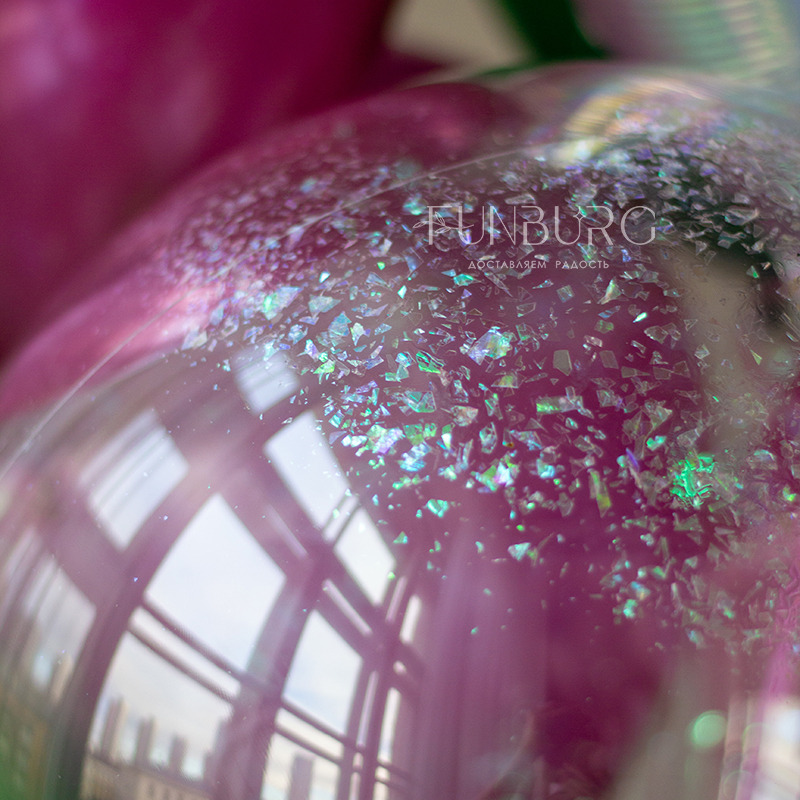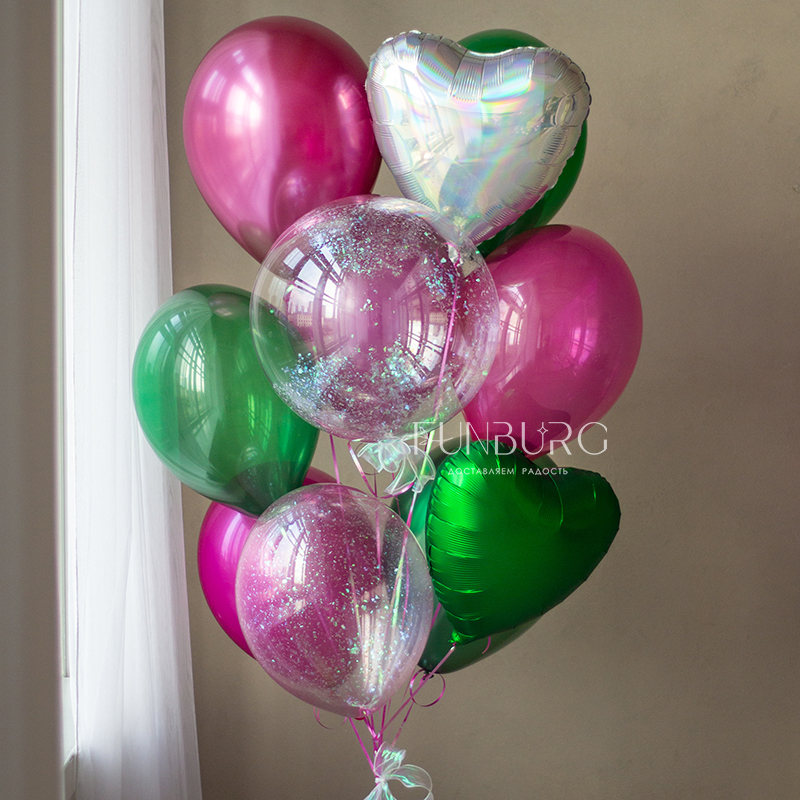 Яркая и волшебная связка шариков в бирюзовых, фиолетовых и розово-пурпурных оттенков, со сверкающими конфетти и переливающимся сердцем.