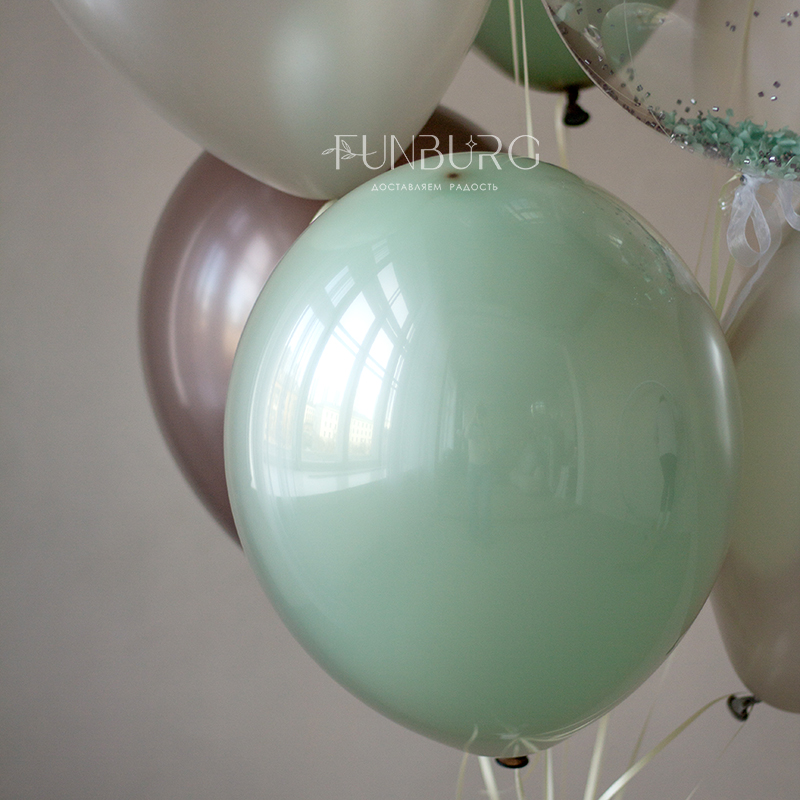 Изысканная связка шариков в необычной дымчато-шалфейной и кремовой гамме, с шариками дизайнерских оттенков, мерцающими шелковыми и матовыми кремовыми шариками и удивительным шаром Bubble с цветочками гортензии и миниатюрными конфетти. Идеально для стильного украшения праздника и подарка любителям всего необычного и утонченного.