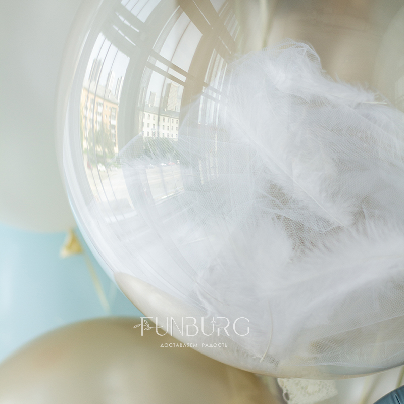 Нежнейшая связка шариков в мягких золотисто-сливочных и голубых оттенков, словно легкая туманная дымка летним утром! В ней мы собрали классические матовые и мерцающие шарики Silk, сердечки и Bubble с облачком фатина и перьев внутри. а для завершенности перевязали связку лентой. Идеально для самых нежных поздравлений.