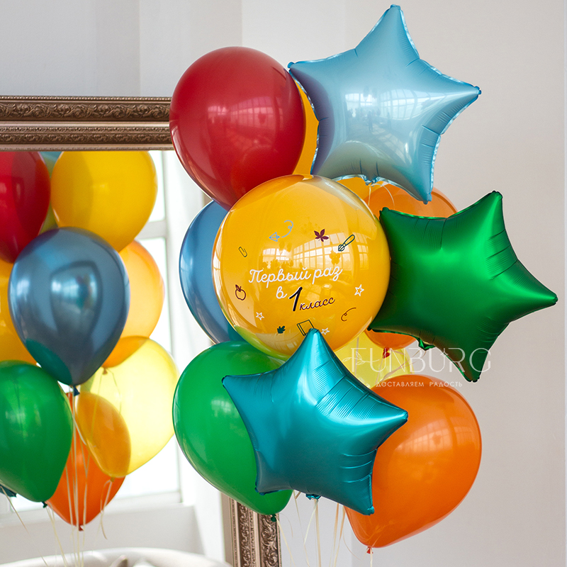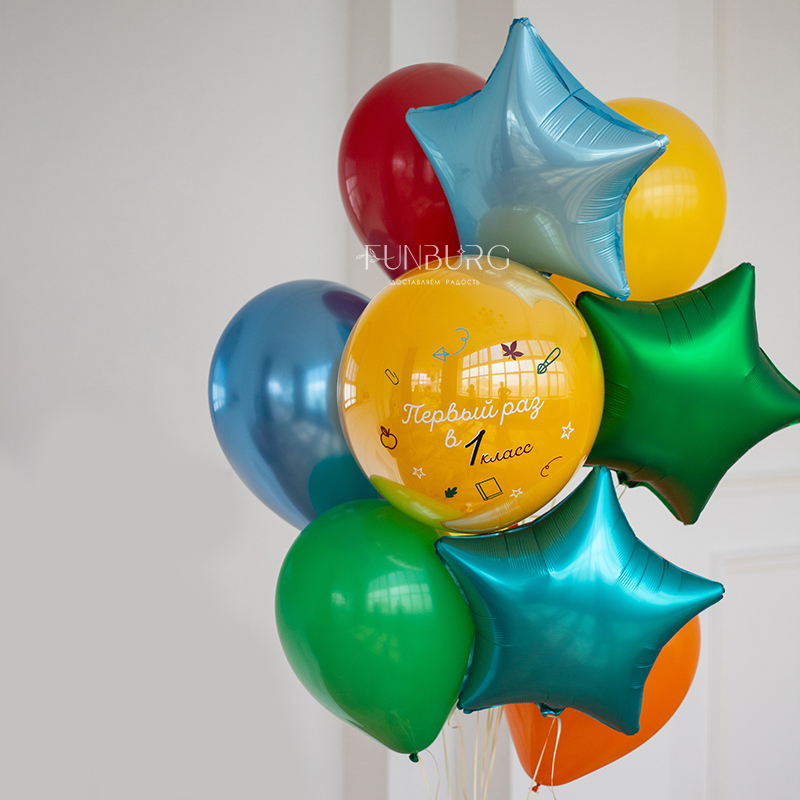 Яркая, полная красок и веселья связка шариков, с которой Первое сентября точно будет полно радости! А если изменить надпись на стеклянном шаре, связка идеально подойдет для детского дня рождения или для любителей ярких красок!