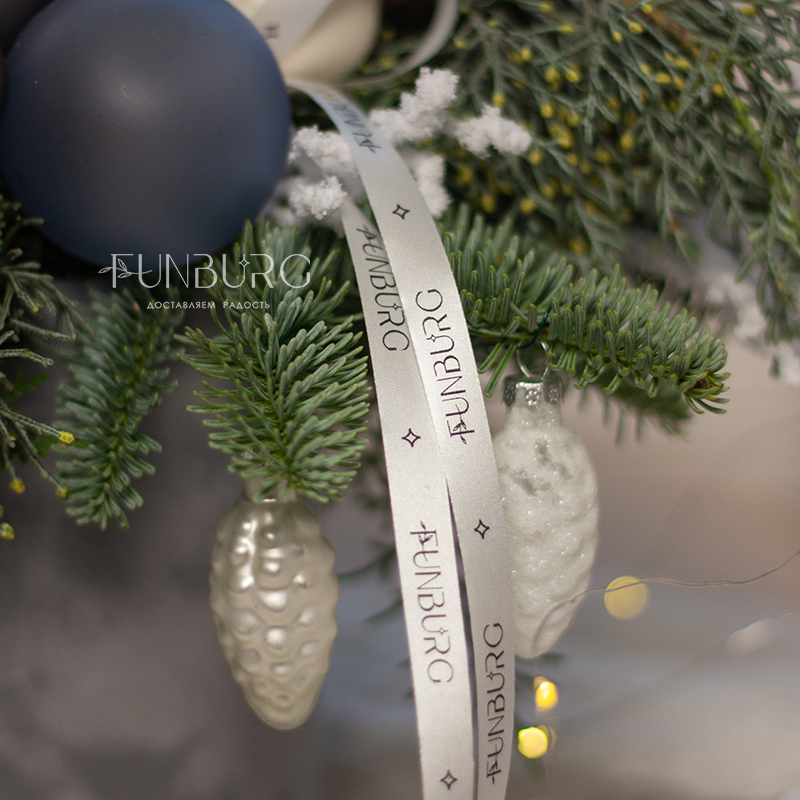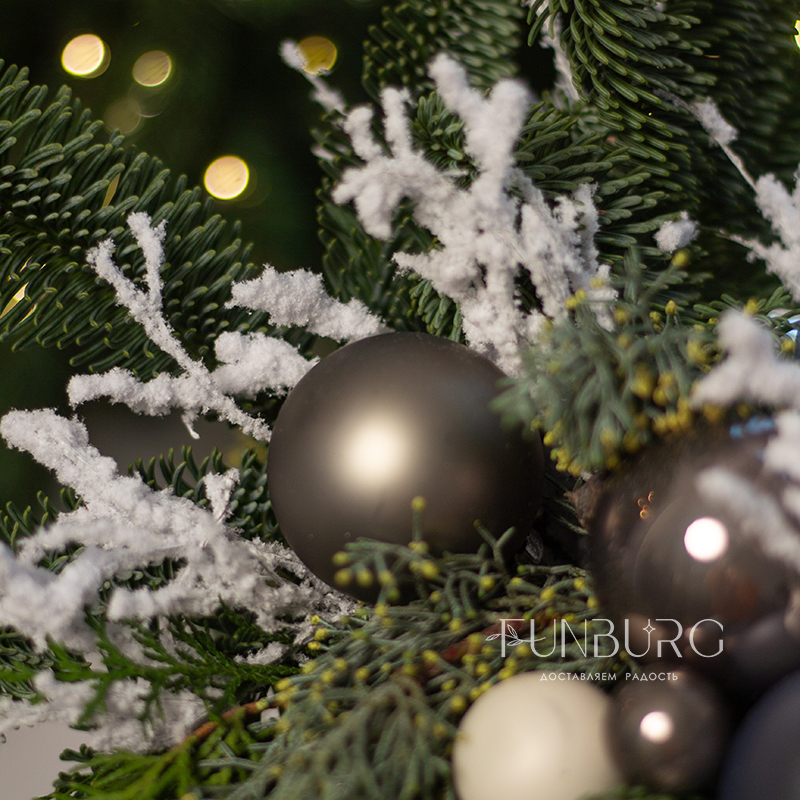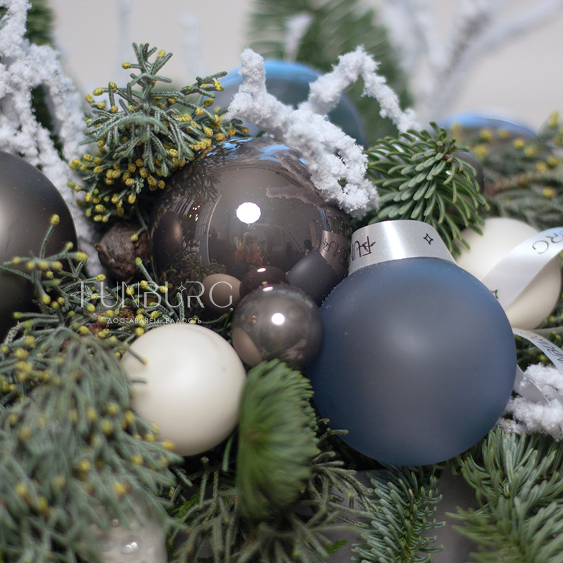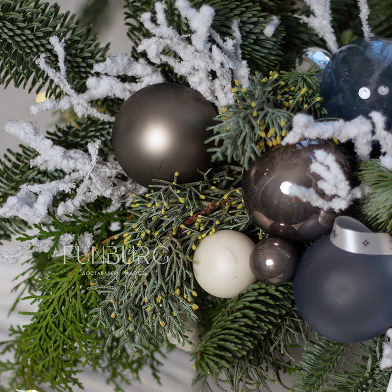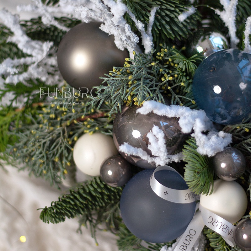 Раскидистая композиция из веточек ароматного нобилиса, пушистого кипариса и туи, с украшением из морозно-голубых, сливочных и дымчатых сверкающих и матовых ёлочных шариков и заснеженных веточек. Идеальное зимнее украшение дома, подарок на зимний праздник и даже альтернатива новогодней ёлки!