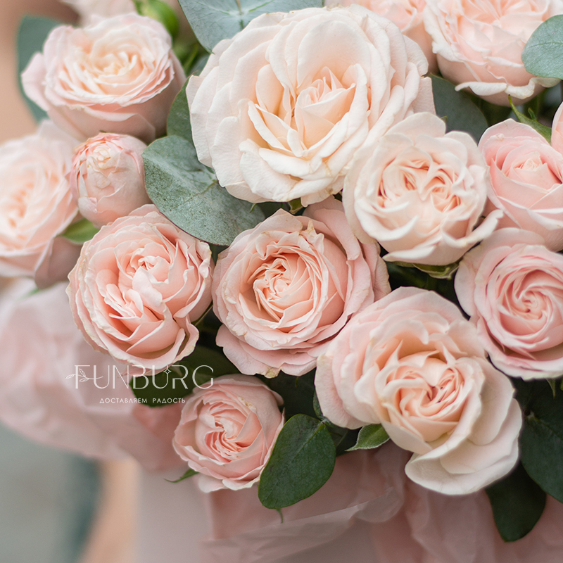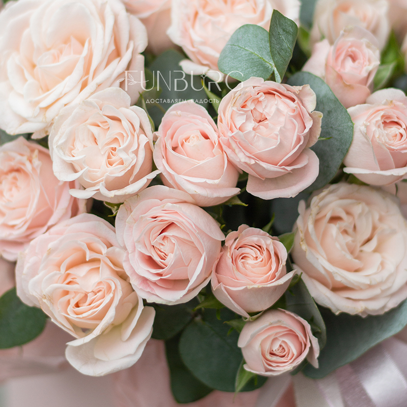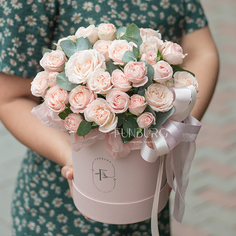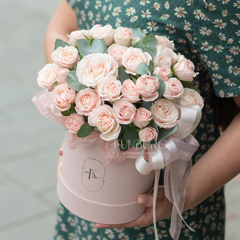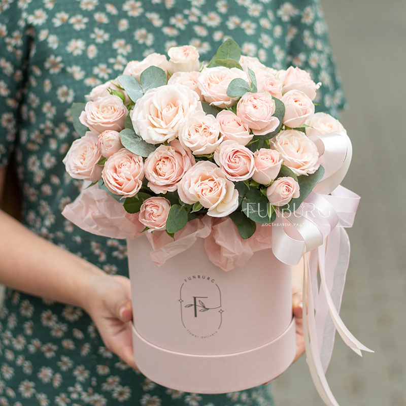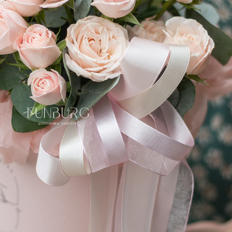 Безупречно нежная пудровая шляпная коробка с монокомпозицией из сливочно-розовых пионовидных кустовых роз сорта Bombastic. Просто, стильно, минималистично и невероятно красиво.