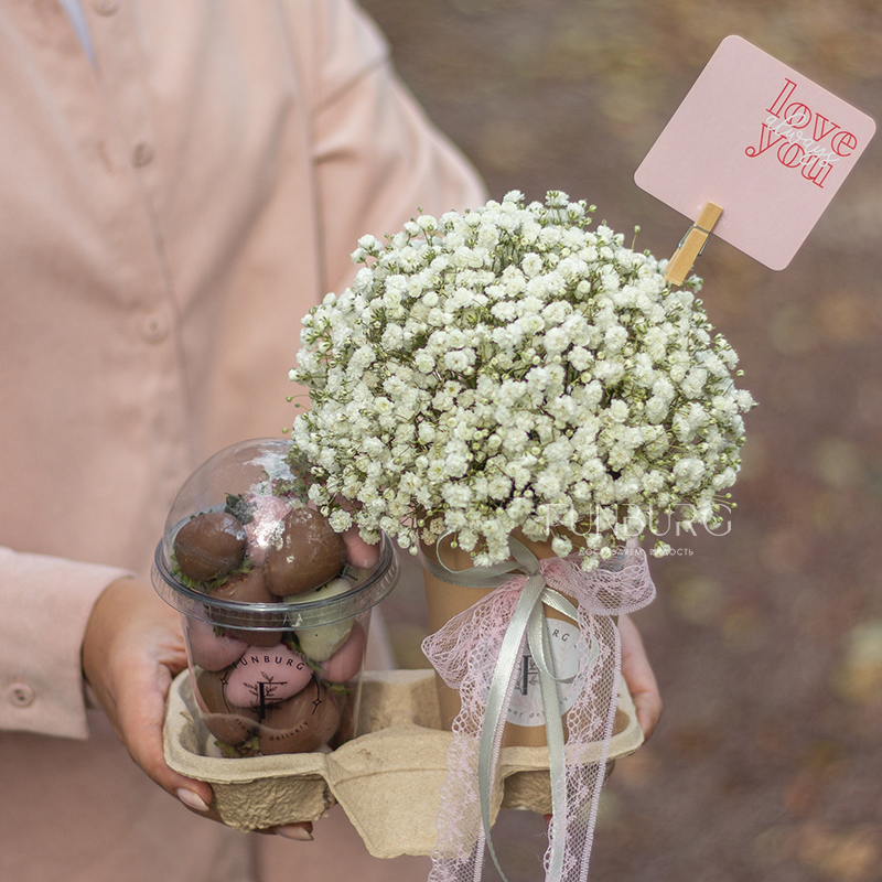 Самый желанный дуэт: воздушный цветочный коктейль из невесомой гипсофилы и свежая клубника в шоколаде в стаканчике! Красиво, романтично вкусно и необычно! Идеально для приятных сюрпризов по поводу и без! Композицию мы дополнили небольшой милой карточкой (ее вы можете выбрать в разделе открыток)