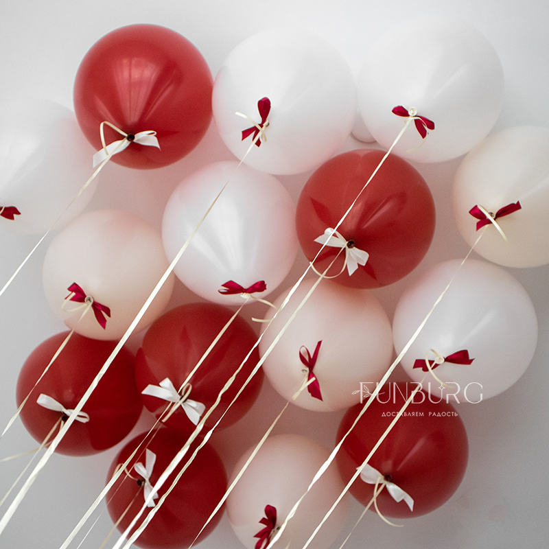 В нашем примере использовано праздничное сочетание насыщенно-красных, кремовых и белых шариков и контрастных бантиков в тон, но вы можете выбрать любой цвет шариков линейки «пастель», «кристалл» или «металл», а также цвет бантиков, и указать пожелания в комментариях заказу.
