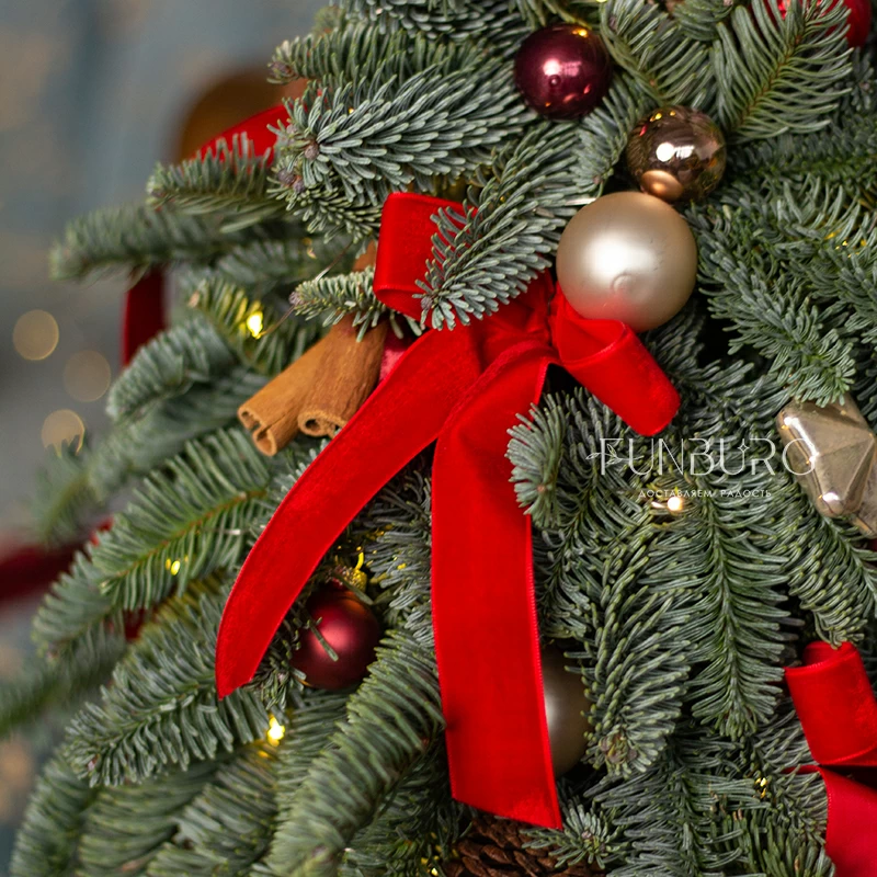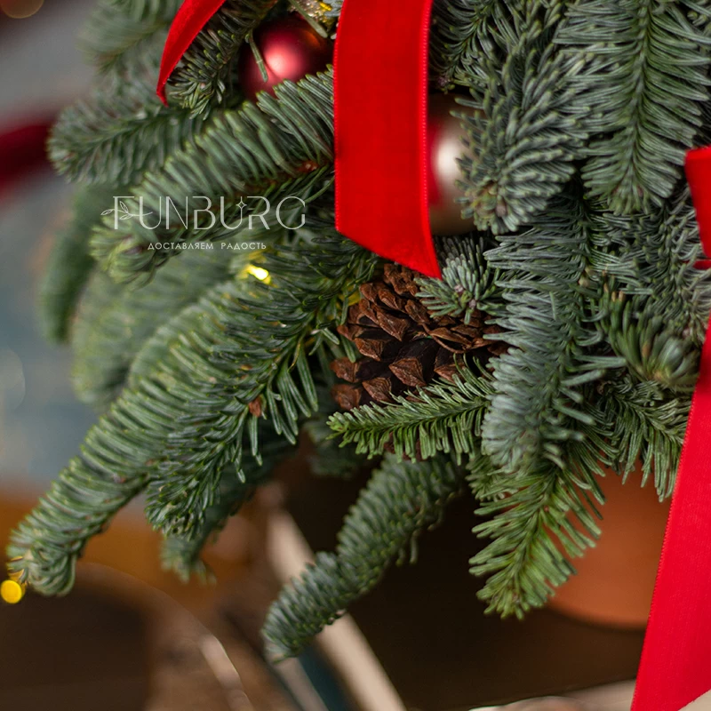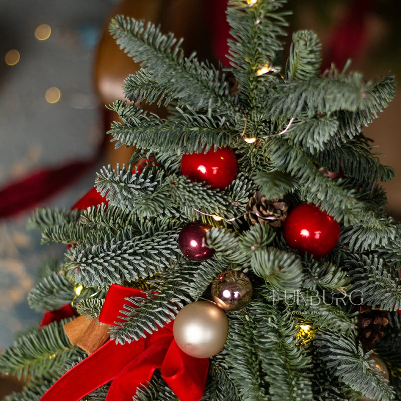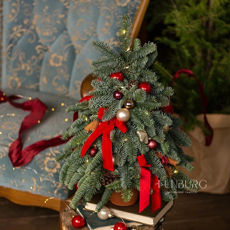 Пушистая настольная ёлочка из ароматных веточек живой голубой ели, украшенная сверкающими елочными шариками и звездочками в классической красной гамме, бархатными бантами и светодиодной гирляндой, станет стильным украшением интерьера, необычной и компактной альтернативой новогодней ёлки, подарит праздничное настроение и уют! Благодаря небольшому размеру, елочка не занимает много места, ее можно без труда разместить даже на рабочем столе.